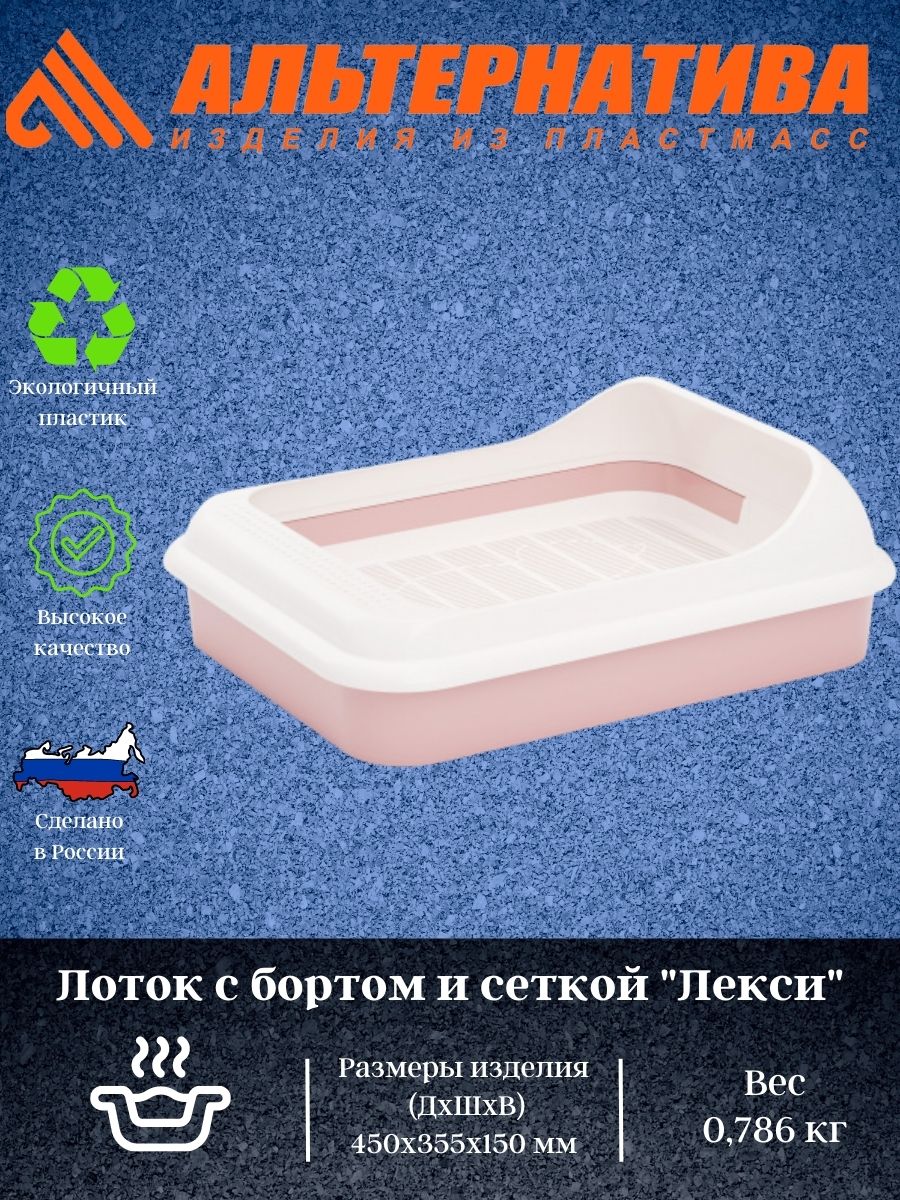 Лоток из коллекции «Лекси» изготовлен из качественного прочного пластика. Материал абсолютно безопасен для здоровья питомца и не имеет посторонних химических запахов. Высокий борт надежно фиксируется по периметру лотка и предотвращает разбрасывание наполнителя. Борт легко убирается, если Ваш любимец еще совсем маленький и ему трудно залезть в лоток. Наличие сетки позволяет использовать лоток как с наполнителем, так и без него. Отсутствие острых углов делает изделие безопасным. Лоток не занимает много места, легко моется водой.