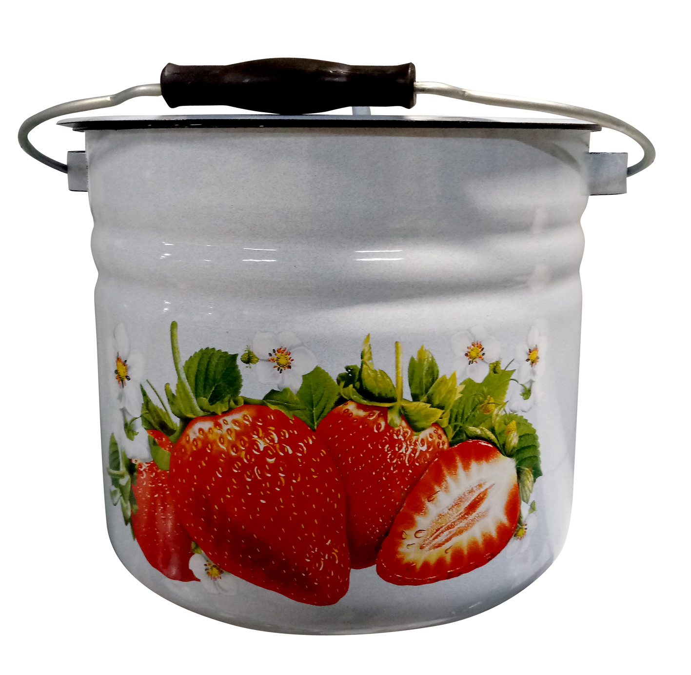 Эмалированное ведро с крышкой, ручкой и деревянным держателем. Ведро отличается долговечностью и имеет высокую устойчивость к износу при длительном сроке эксплуатации. Такое ведро подходит для хранения и переноски продуктов и воды, а также для готовки и хранения заготовок.