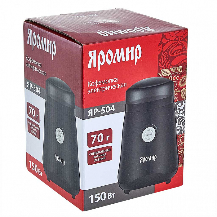 Кофемолка «Яромир» ЯР-504 способна за один раз измельчить до 70 г кофейных зерен. Корпус устройства сделан из ударопрочного пластика, а нож выполнен из металла, устойчивого к коррозии. Есть защита, предотвращающая включение при незакрытой крышке.
