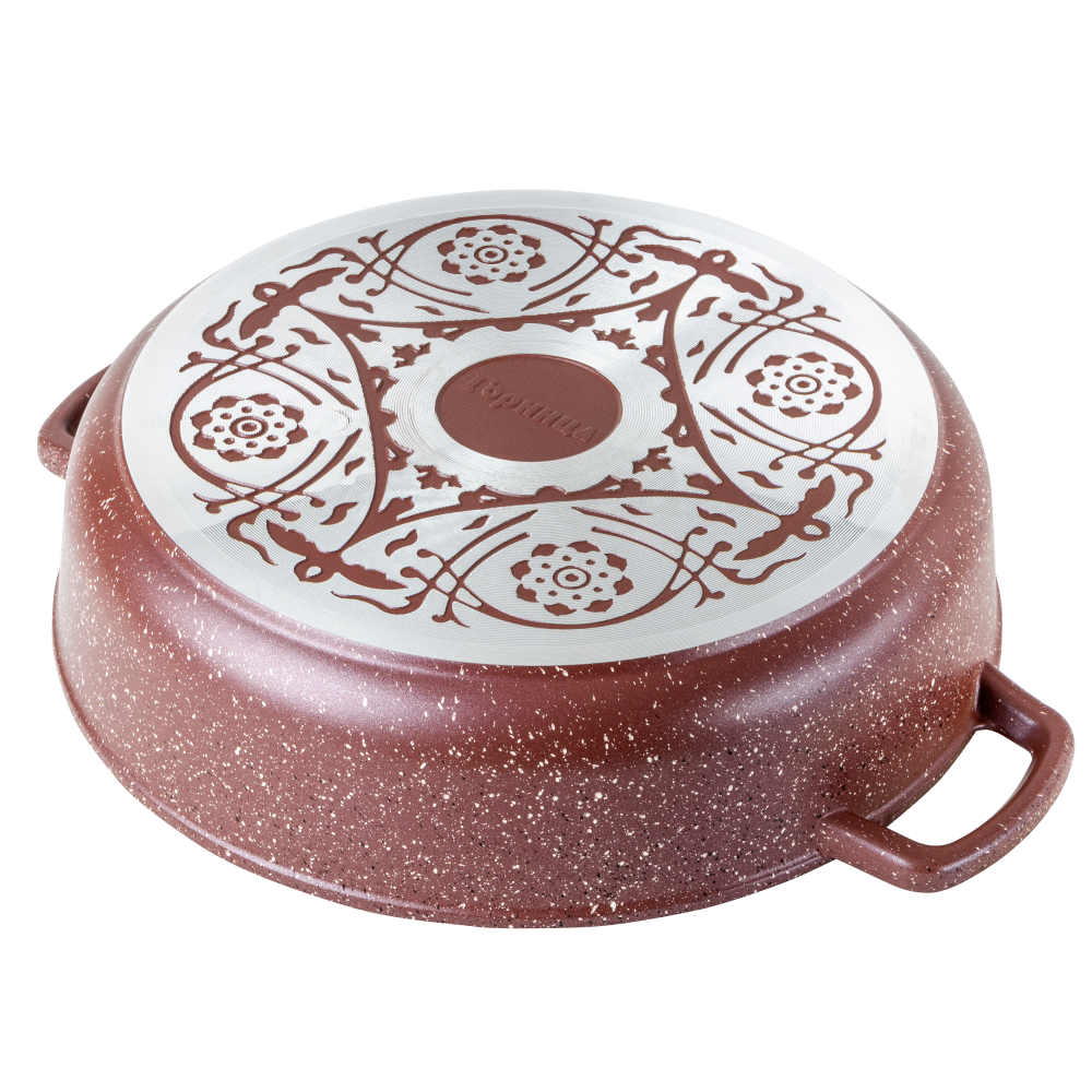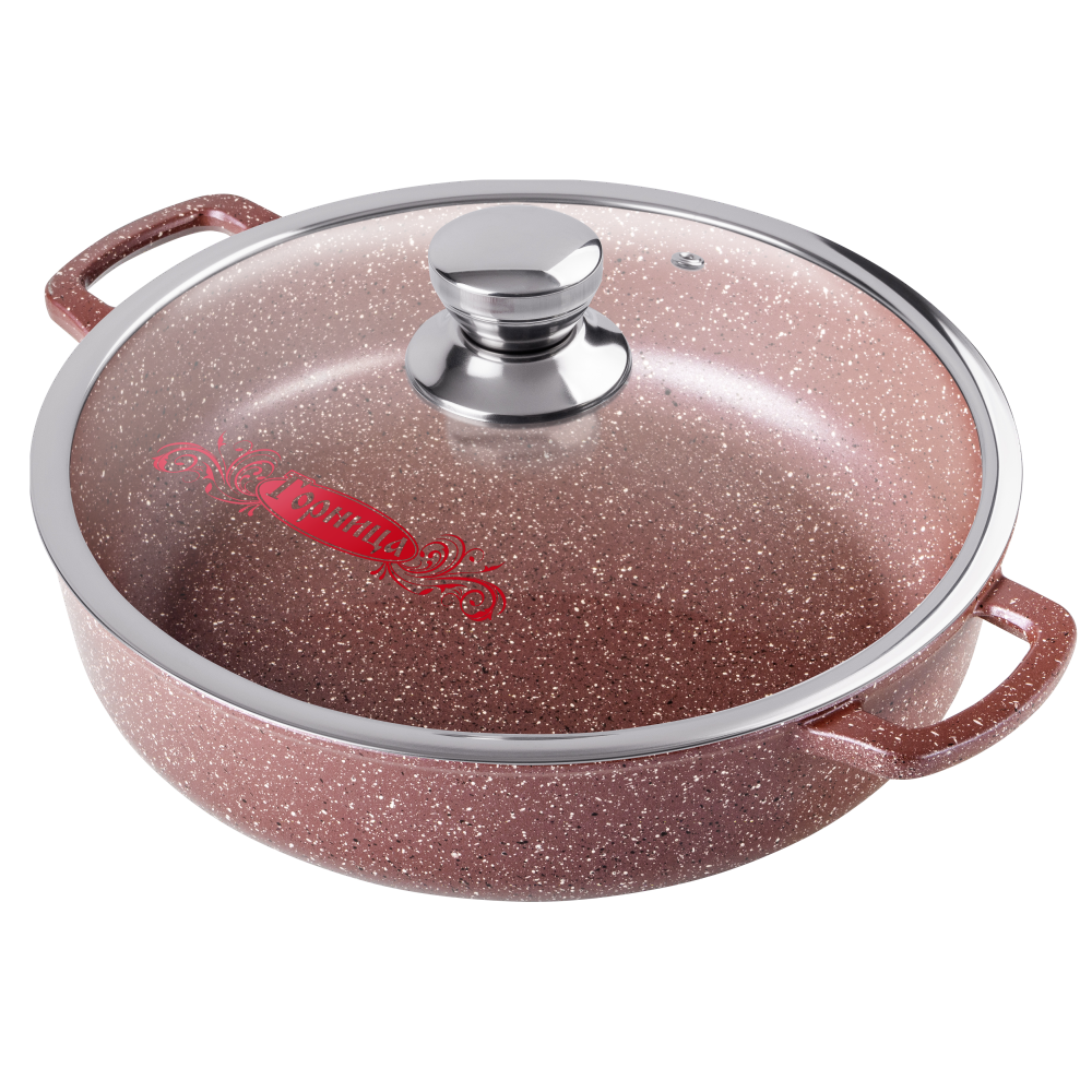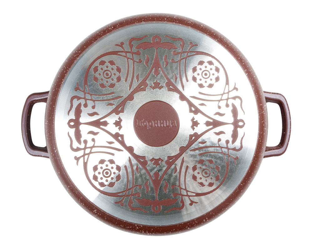 Также в ней можно приготовить плов рагу, жаркое или даже испечь пирог. «Шоколад». Коллекция посуды с улучшенным четырёхслойным антипригарным покрытием. Дополнительный слой с мраморным эффектом увеличивает износостойкость и создаёт оригинальный цветовой эффект мрамора шоколадного оттенка. Литой пищевой алюминий не имеет канцерогенных веществ и посторонних запахов.
