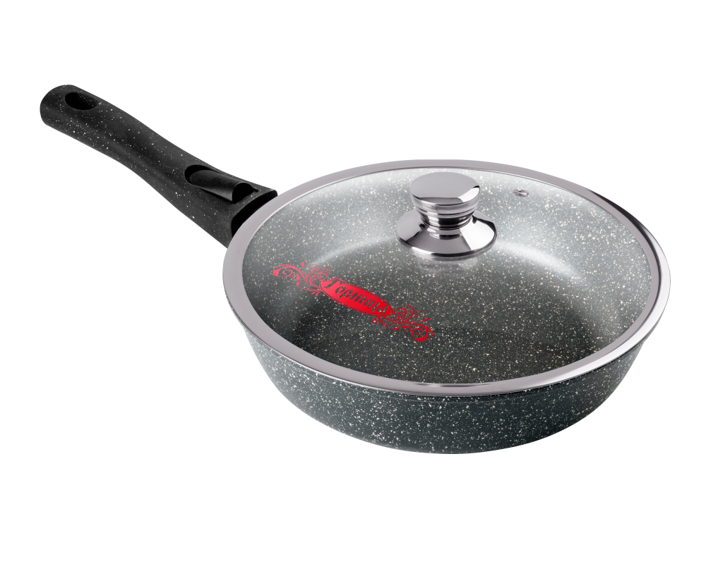 Литая алюминиевая сковорода с антипригарным покрытием – оригинальная посуда ТМ Горница, которая подходит для газовых, электрических, стеклокерамических плит. «Гранит». Коллекция «мраморной посуды» с улучшенным четырёхслойным антипригарным покрытием. Дополнительный слой с мраморным эффектом увеличивает износостойкость и создаёт оттенок чёрного мрамора. Сковорода литая изготовлена из пищевого алюминия без канцерогенных веществ. Антипригарная сковорода имеет толстые стенки и утолщенное дно, что способствует равномерному распределению тепла и создает благоприятные условия для качественного процесса готовки.