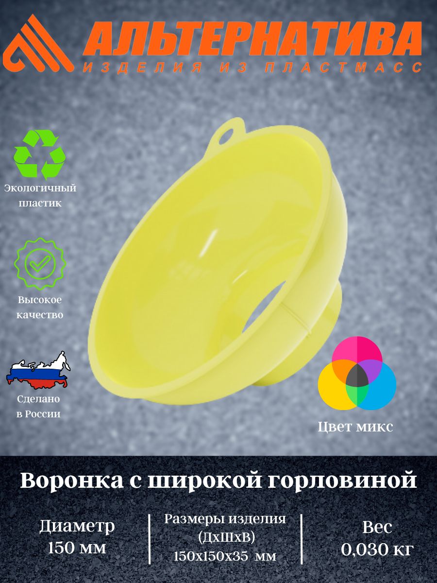 Воронка является приспособлением для переливания жидкости. Изготовлена из качественной пластмассы, имеет плотные стенки, хорошо моется, не впитывает в себя посторонние запахи. Данный вид воронки имеет широкое горло и кромку по краю в размере 1 см, что дает возможность переливать через такую воронку большой объем жидкости, не опасаясь, что жидкость может перелиться через края воронки. Подходит, по размерам горловины, для стеклянных банок, канистр, бочек. Выполнено изделия в нескольких цветовых вариантах, пригодно для использования с пищевыми продуктами.