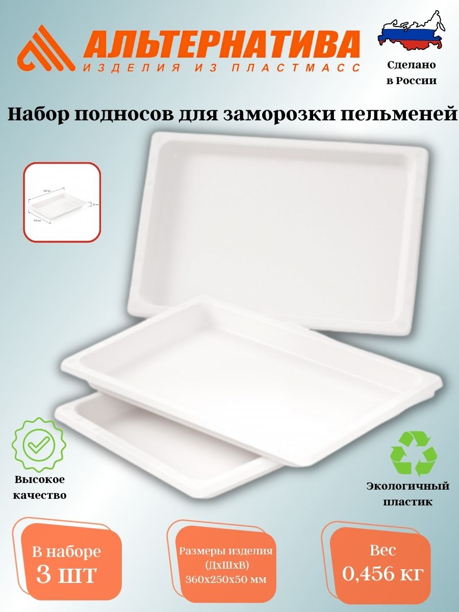 Углубленные прямоугольные подносы очень удобны для заморозки пельменей, мантов, котлет, так как решают вопрос рационального размещения большого количества заготовок. Высокие бортики защищают продукты от случайного падения при выемке из морозильной камеры. На дне изделия имеются рельефные полосы, предотвращающие прилипание продуктов к подносу, после заморозки их легко снять с поверхности.