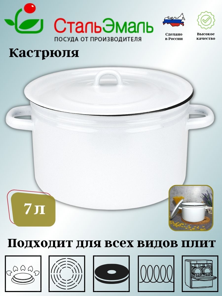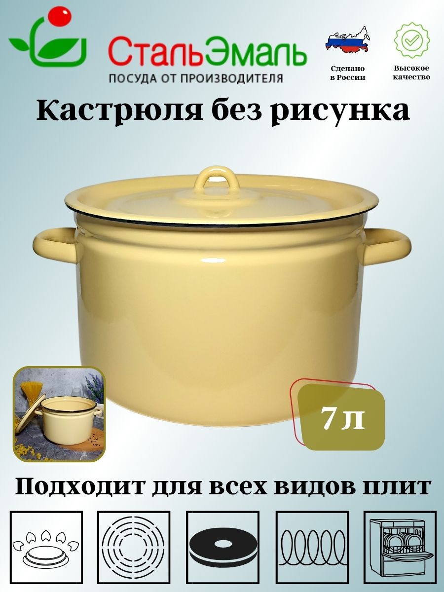 Кастрюля с крышкой изготовлена из высококачественного стального проката, покрытого двумя слоями жаропрочной эмали. Каждый слой покрытия закреплён высокотемпературным обжигом. Эмалевое покрытие имеет существенные преимущества по показателям безопасности влияния на организм человека, санитарным свойствам, простоте ухода и рассчитан на длительный срок эксплуатации. Благодаря двойному слою эмалевого покрытия исключается проникновение в пищу оксидов металла. Прочный корпус из холоднокатаного проката гарантирует эффективную тепловую обработку пищи. Подходит для использования на всех типах плит, включая индукционные. Можно мыть в посудомоечной машине.