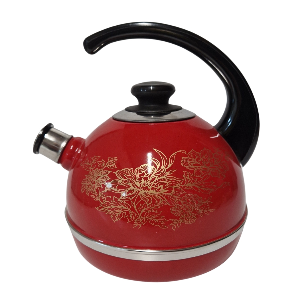 Чайник эмалированный со свистком. Внешнее трехслойное эмалевое покрытие не вступает во взаимодействие с пищевыми продуктами, защищает сталь от коррозии, придает посуде гладкую стекловидную поверхность и надежно защищает от кислот и щелочей. Фиксированная консольная бакелитовая ручка. Свисток съемный из нержавеющей стали. Крышка плотно прилегает к краю. Может быть использован на всех типах кухонных плит: электрических, газовых, керамических, индукционных. Подходит для мытья в посудомоечной машине.