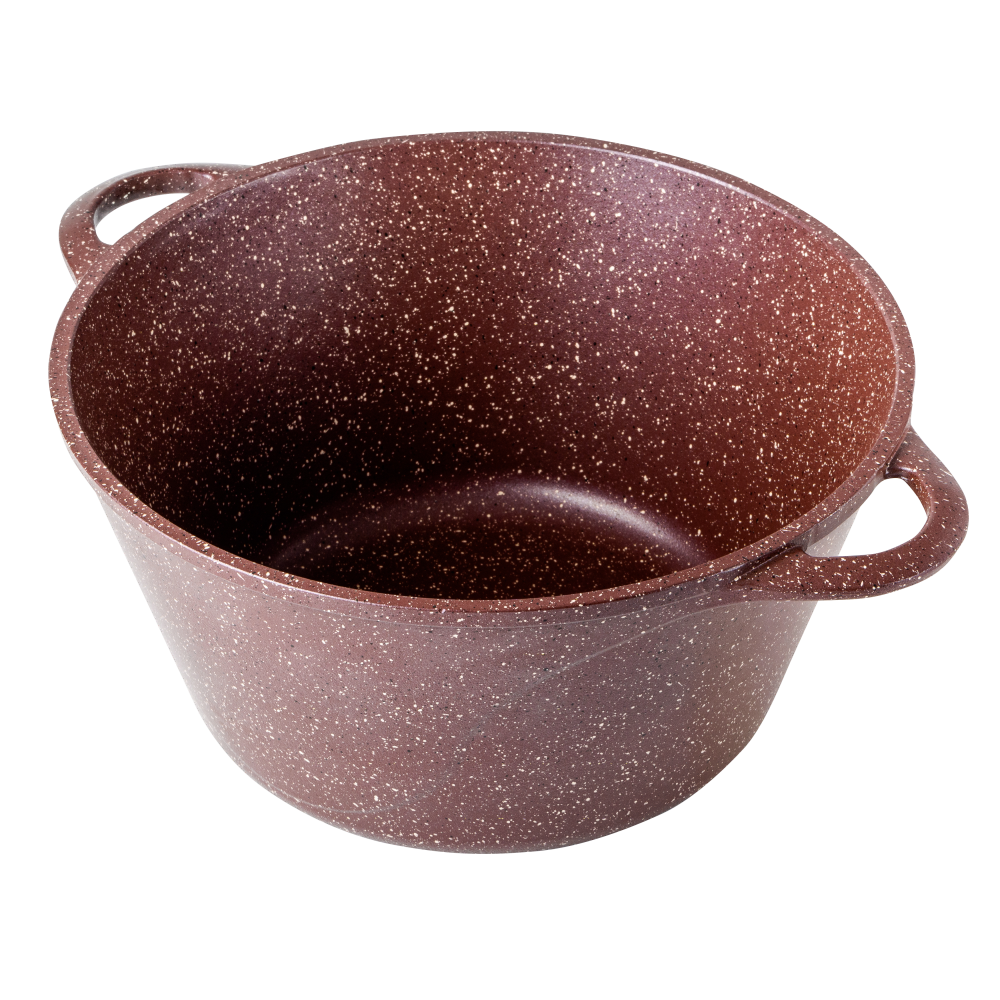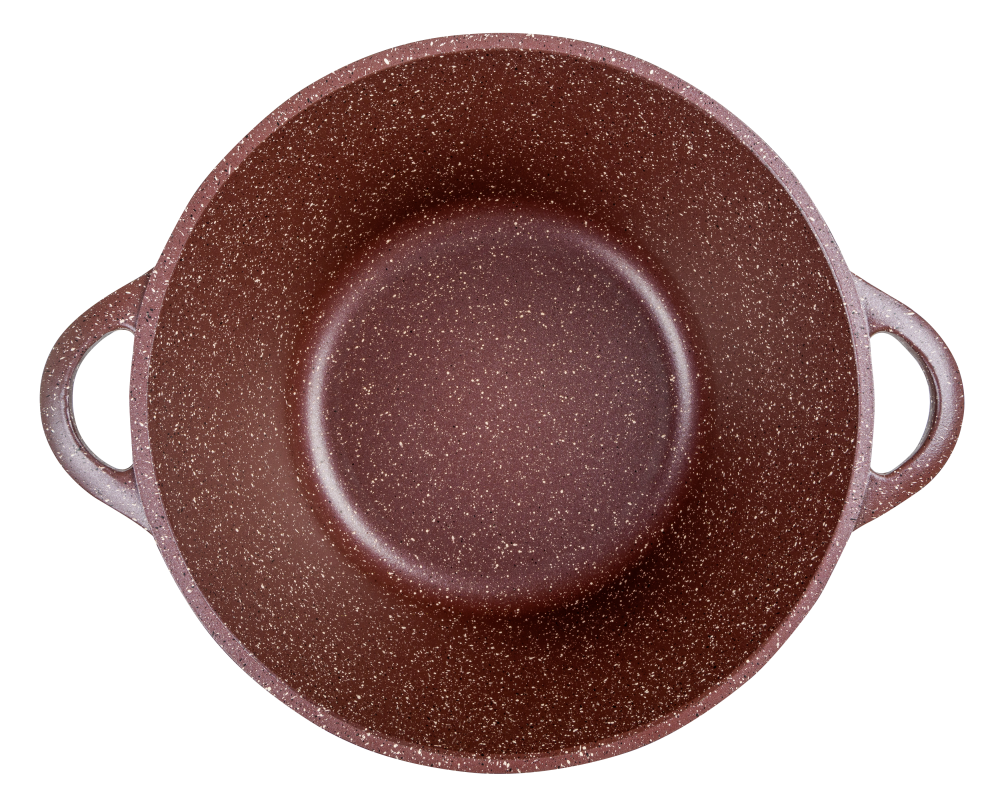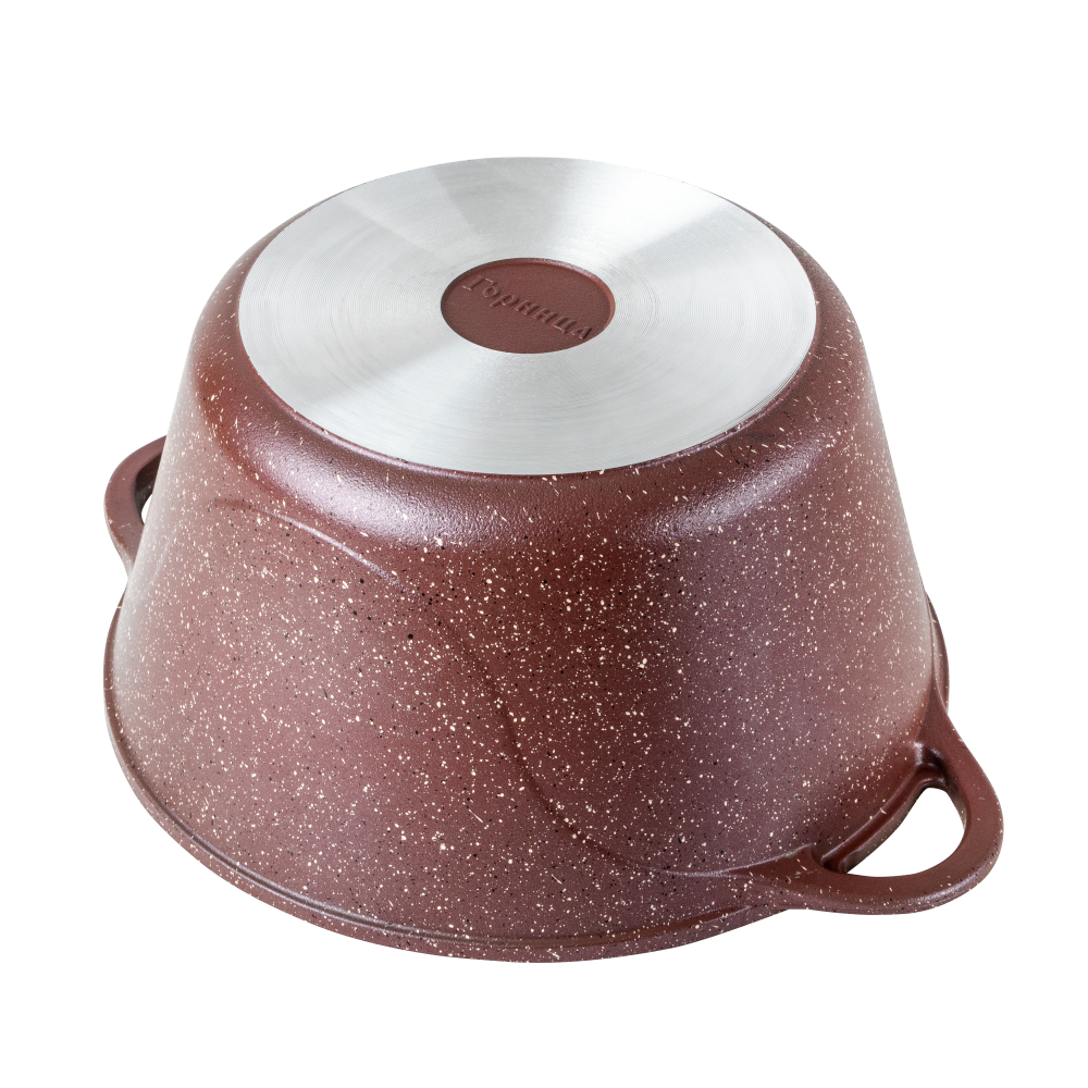Литая алюминиевая кастрюля с антипригарным покрытием подходит для газовых, электрических и стеклокерамических плит. Кастрюли с цельнолитыми ручками можно использовать в духовом шкафу. «Шоколад». Коллекция посуды с улучшенным четырёхслойным антипригарным покрытием. Дополнительный слой с мраморным эффектом увеличивает износостойкость и создаёт оригинальный цветовой эффект мрамора шоколадного оттенка. Литой пищевой алюминий не имеет канцерогенных веществ и посторонних запахов. Толстые стенки и дно обеспечивают равномерное приготовление блюда. Посуда не деформируется при нагревании. Антипригарное покрытие на водной основе без вредных химических соединений: экологично и безопасно. Мелкие царапины не влияют на безопасность антипригарного покрытия. В кастрюле можно готовить без масла, ее легко мыть.