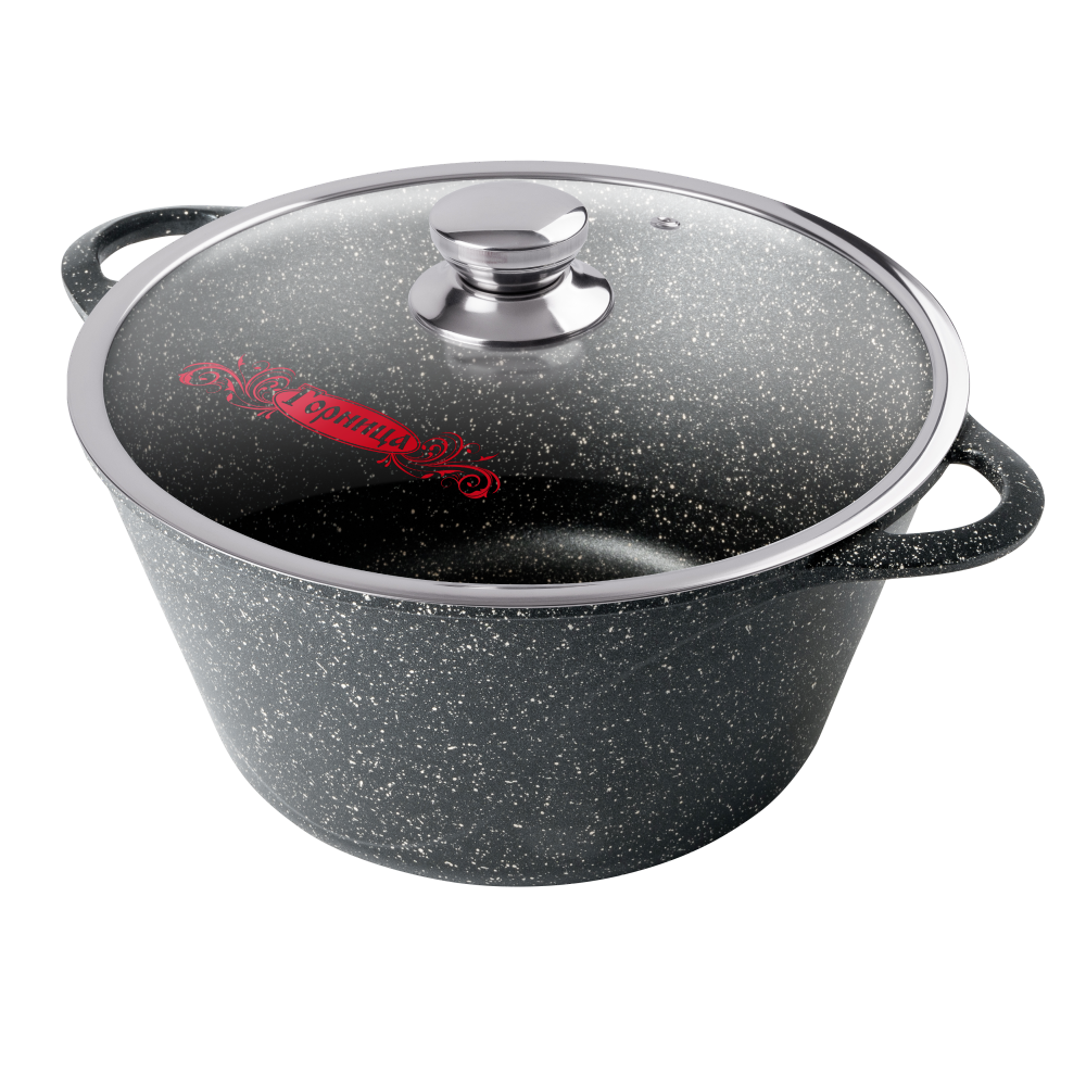 Литая алюминиевая кастрюля с антипригарным покрытием подходит для газовых, электрических и стеклокерамических плит. Кастрюли с цельнолитыми ручками можно использовать в духовом шкафу. «Классик». Базовая коллекция с однотонным чёрным покрытием.