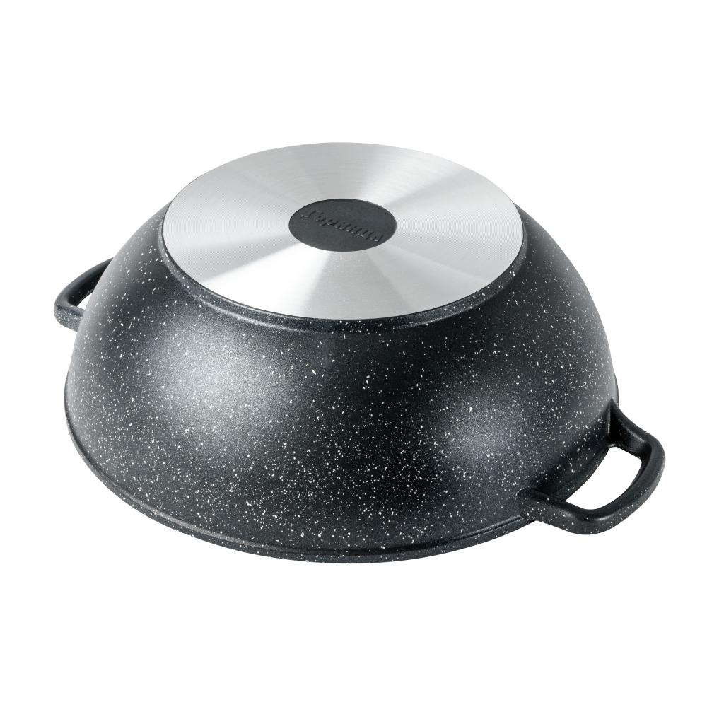 Литой алюминиевый казан с антипригарным покрытием подходит для газовых, электрических и стеклокерамических плит, а также для открытого огня.
