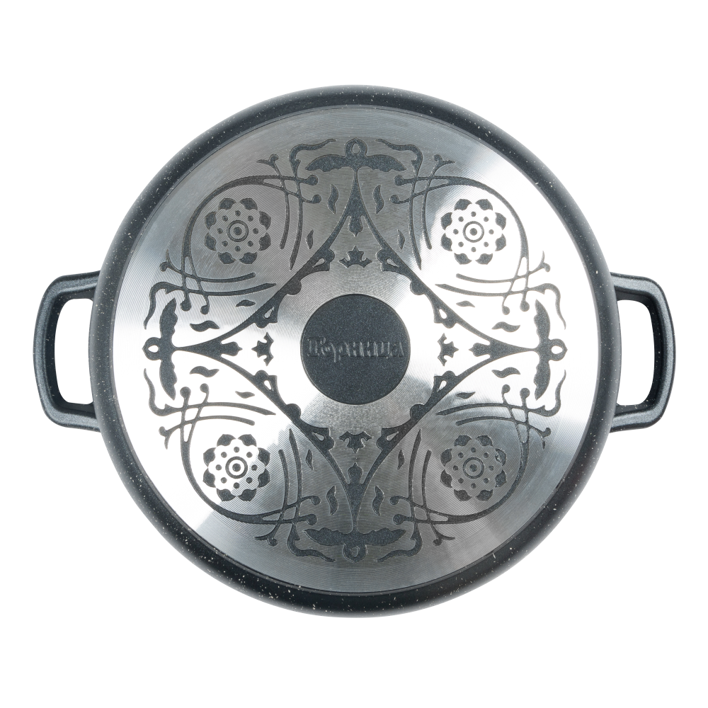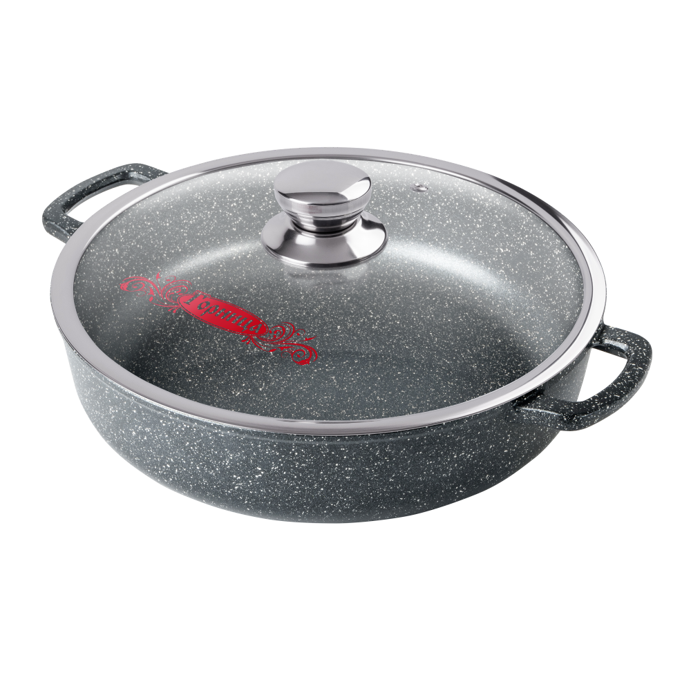 Также в ней можно приготовить плов рагу, жаркое или даже испечь пирог. «Гранит». Коллекция посуды с улучшенным четырёхслойным антипригарным покрытием. Дополнительный слой с мраморным эффектом увеличивает износостойкость и создаёт оригинальный оттенок чёрного мрамора. Литой пищевой алюминий не имеет канцерогенных веществ и посторонних запахов. Толстые стенки и дно обеспечивают равномерное приготовление блюда.