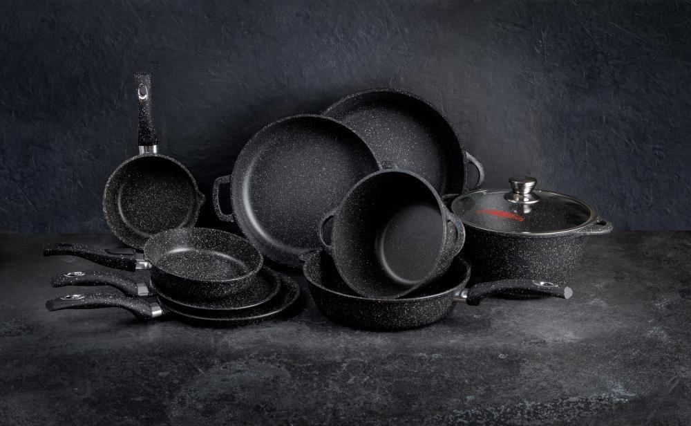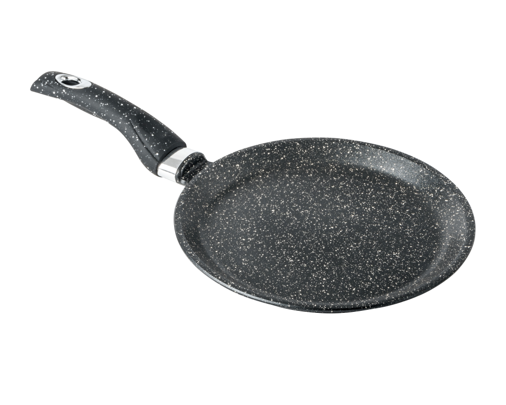 Блинная сковорода с антипригарным покрытием – литая алюминиевая посуда, которая подходит для газовых, электрических и стеклокерамических плит. При минимальном использовании масла получаются тонкие блины и пышные оладьи. «Гранит». Коллекция «мраморной посуды» с улучшенным четырёхслойным антипригарным покрытием. Дополнительный слой с мраморным эффектом увеличивает износостойкость и создаёт оригинальный оттенок чёрного мрамора.