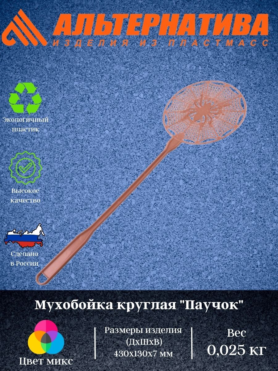 Мухобойка «Паучок» станет эффективным средством по борьбе с мухами и другими насекомыми. Изделие произведено из качественного сырья. Конструкция изделия состоит из основания, выполненного в виде сетки, и удобной рукоятки.