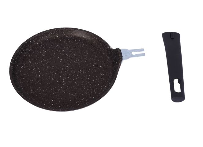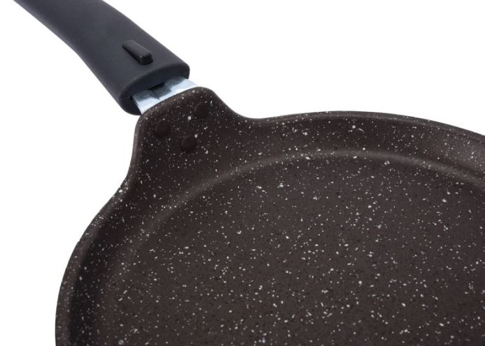 Блинная сковорода Kukmara из литого алюминия имеет отличные теплораспределительные и теплоаккумулирующие свойства, и блины в ней получаются пропеченными и ароматными. Сковороду со съемной ручкой можно использовать для запекания блюд в духовом шкафу. Удобное хранение обеспечивает съемная ручка.