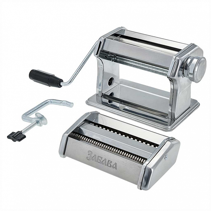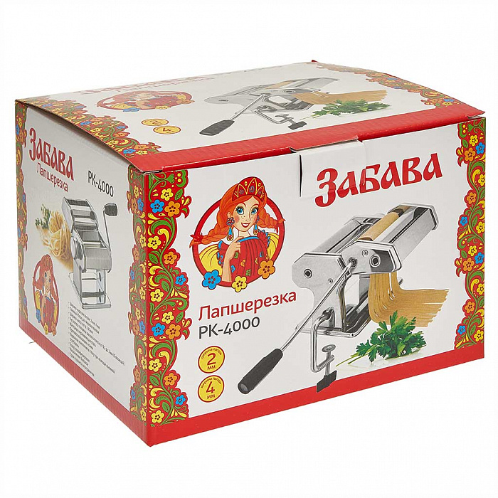 Ручная лапшерезка Забава РК-4000 отличается разборной конструкцией, благодаря которой она не займет много места при хранении. Также такое решение обеспечивает комфорт при очистке прибора от загрязнений. Предназначение устройства сложно переоценить, ведь с его помощью можно готовить лапшу в домашних условиях, отказавшись от аналогичных покупных мучных изделий. Нарезка лапши может производиться шириной 2 или 4 мм, при этом валик способен работать с листом теста шириной до 140 мм.