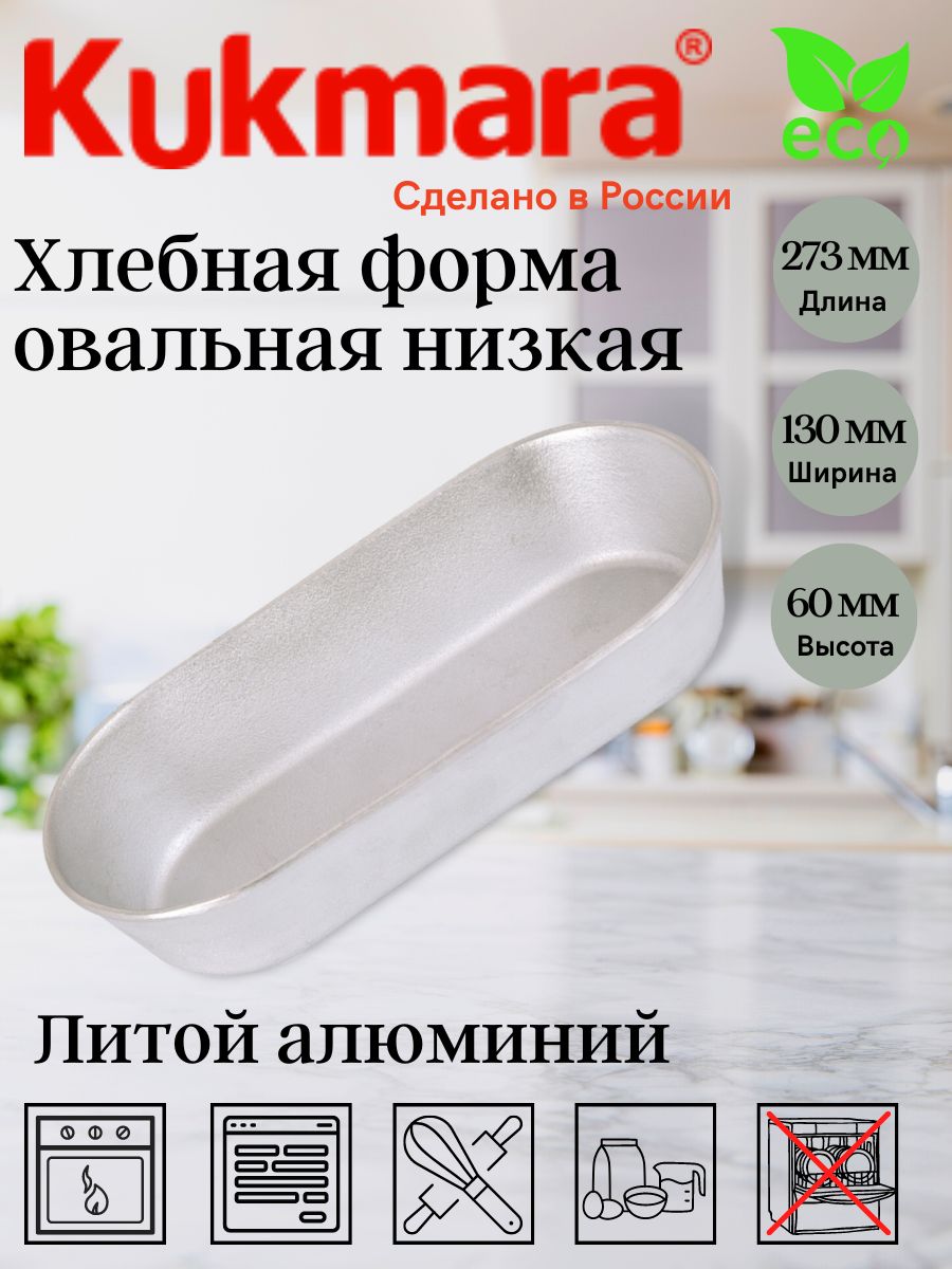 Литая алюминиевая посуда без покрытия всегда была, есть и будет на пике популярности. Тому есть несколько причин: широта ассортимента, доступность и легкость ухода и использования. Посуда из литого алюминия может прослужить долгие годы, сохраняя свои теплораспределительные и теплоаккумулирующие свойства.орпус овальной хлебной формы Kukmara с низкими бортами выполнен из литого алюминия, который обеспечивает быстрый нагрев и равномерное распределение тепла по всей поверхности. Благодаря этому корочка получается румяная, а мякиш воздушный, хорошо пропеченный. Лаконичная форма оснащена небольшими бортиками для более комфортного вынимания из духового шкафа.Овальная хлебная форма Kukmara подходит не только для домашнего использования, но и для автоматизированных комплексов. Хлебная форма удобна, легко очищается, с ней приятно работать.