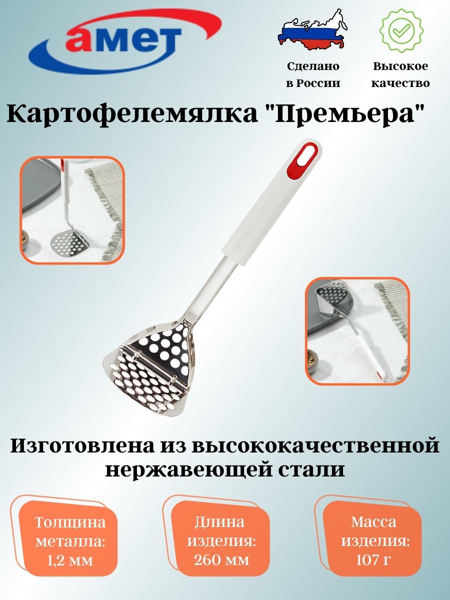 Картофелемялка - для приготовления пюре (из отварного картофеля и других овощей, мягких ягод). Оригинальная Г-образная форма позволяет просто очищать изделие от пюре.