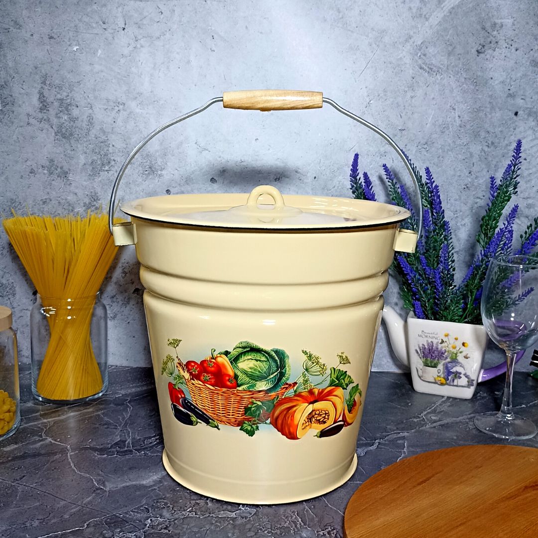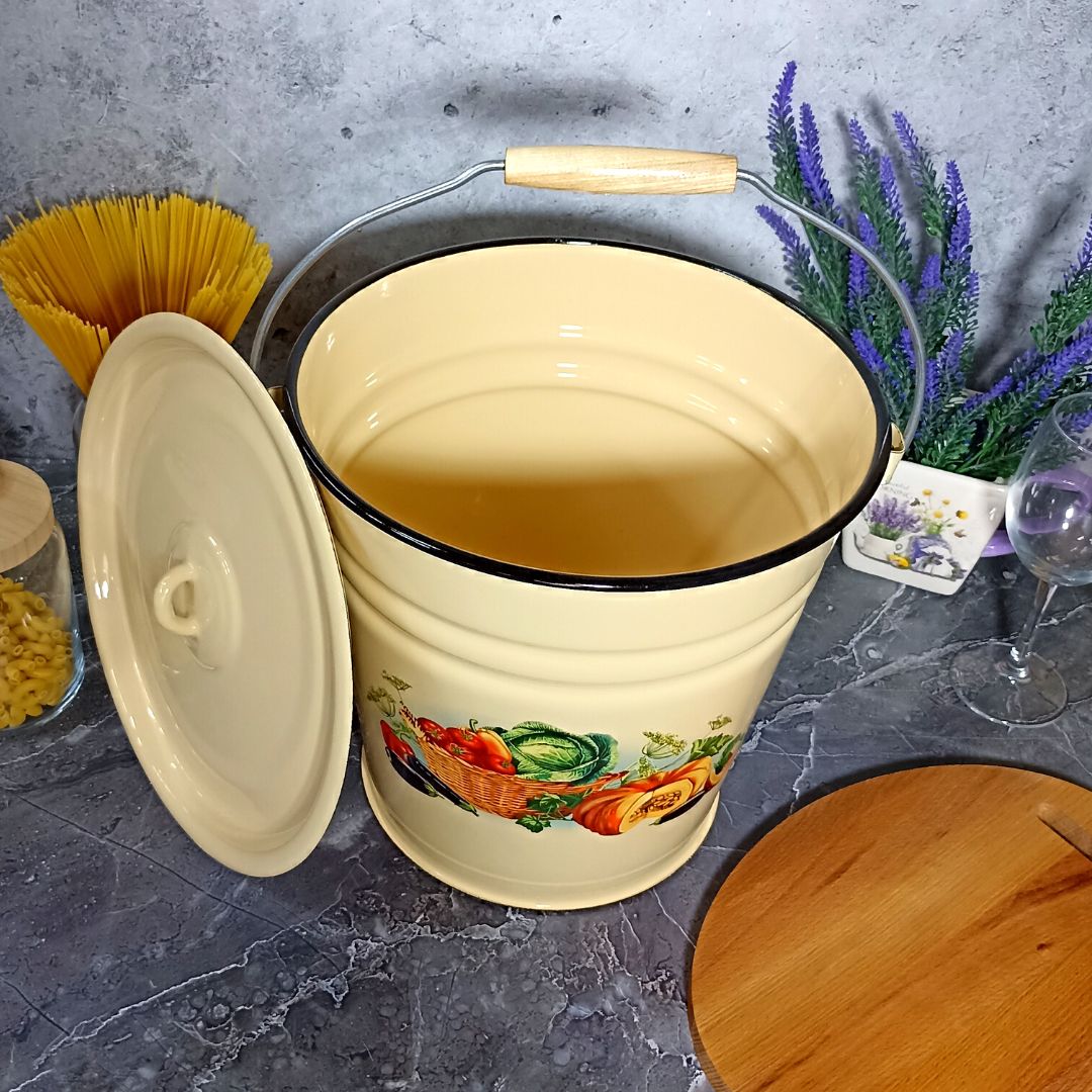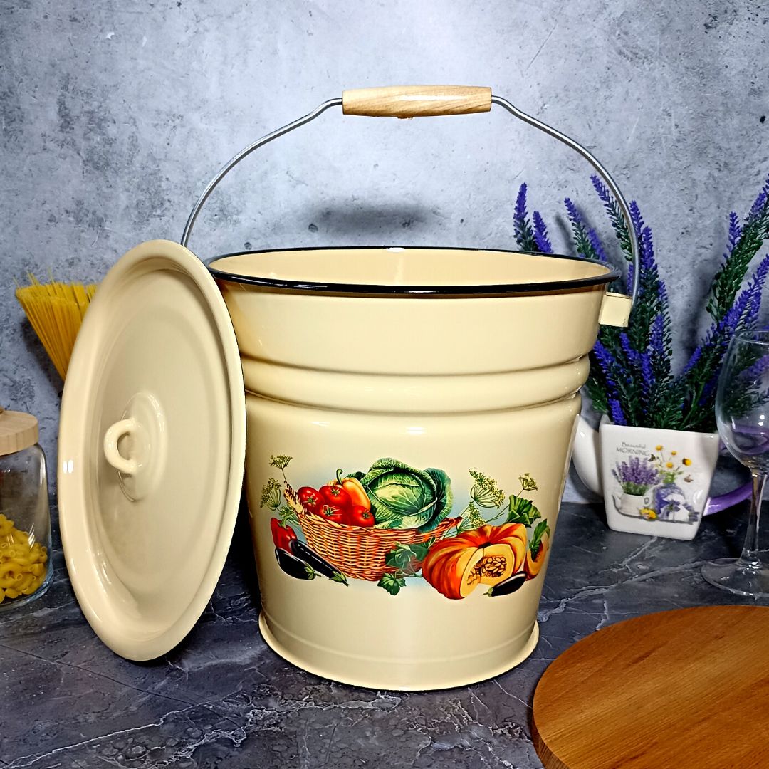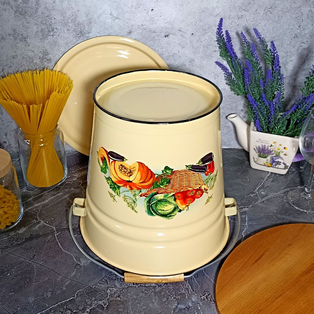 Классическое эмалированное ведро с крышкой и ручкой, снабженной деревянным держателем — такое можно встретить на многих дачах и в загородных домах. В нем удобно хранить фрукты и овощи, а при желании можно использовать вместо большой кастрюли, чтобы сварить варенье, компот или суп. Крышка предотвращает испарение жидкости, а также защищает от попадания инородных предметов в пищу (различного мусора, пыли, насекомых). Деревянный держатель на ручке добавляет удобства при переноске полного ведра.