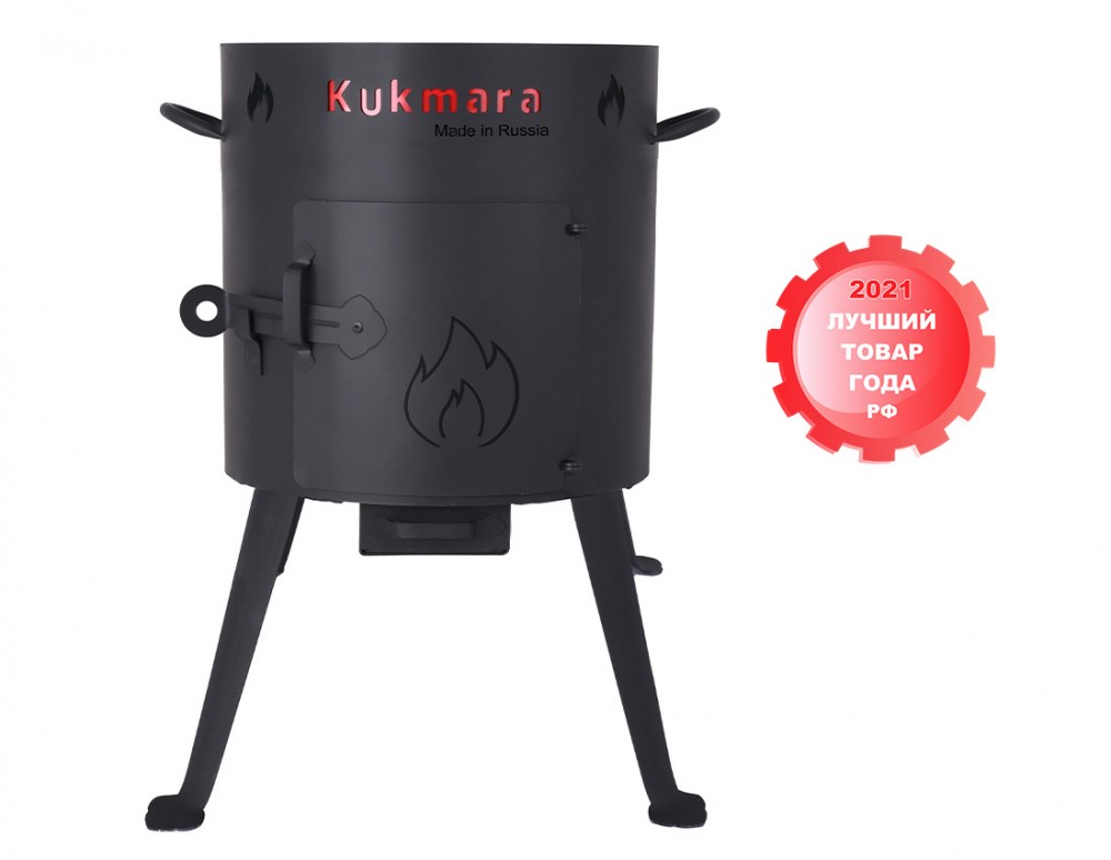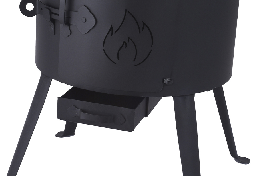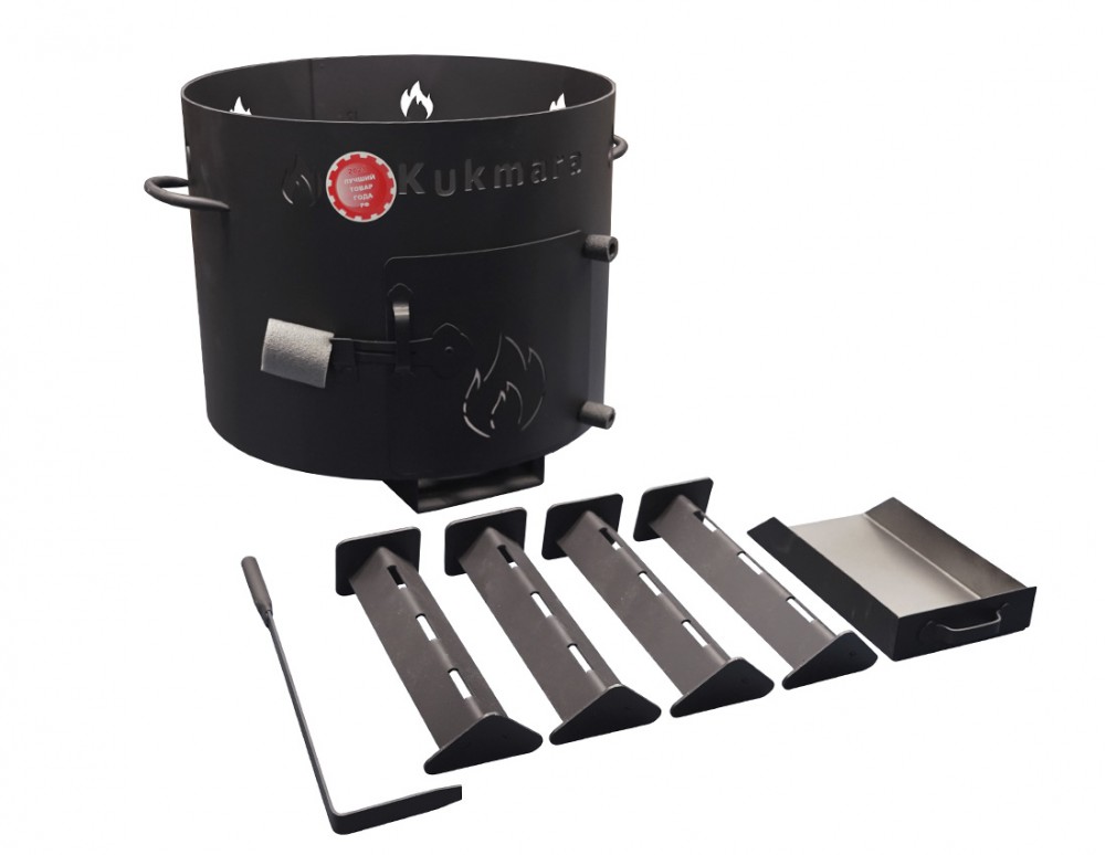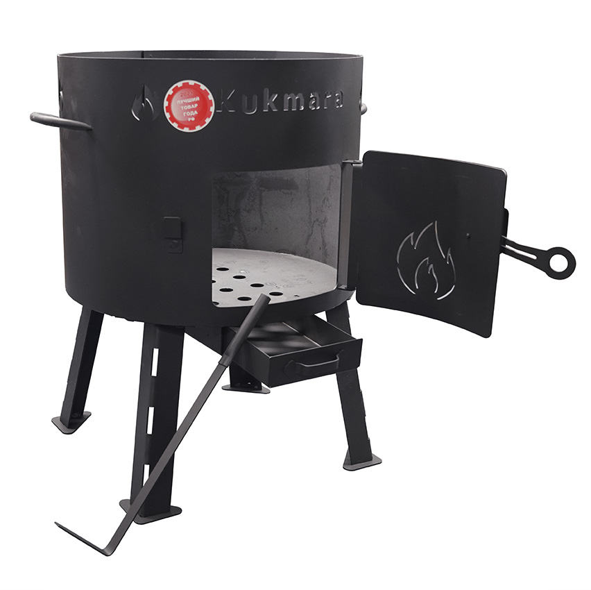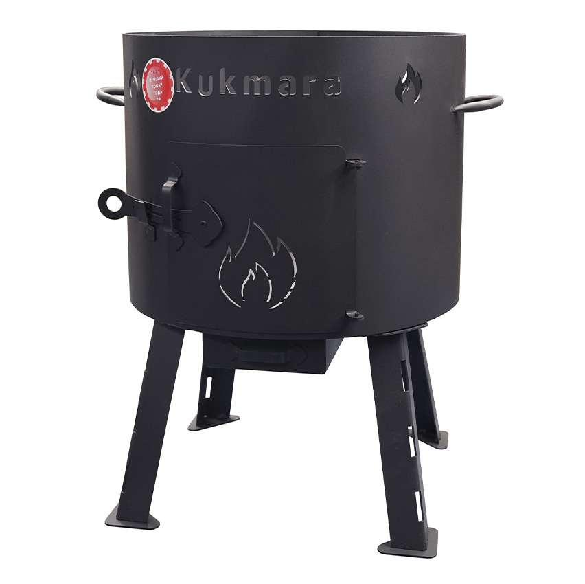 Обязательным атрибутом отдыха на свежем воздухе является учаг для казана 12 литров от бренда Kukmara. Конструкция простая и очень удобная для приготовления еды в казане на открытом огне. Обеспечивается максимальная безопасность и комфорт по сравнению с открытым огнем, треногой, или мангалом. Разжигание топлива происходит внутри корпуса, соответственно, весь жар окутывает стенки казана и тепло не уходит во вне, как это бывает с костром. Процесс приготовления пищи проходит значительно быстрее, дров нужно при этом меньше. Учаг представляет собой металлический цилиндр диаметром 40,6 см с дверцей для закладки топлива внутрь, оснащенный съемными ножками. Оптимальная толщина стенок (2 мм) исключает возможность их деформации.Термостойкое покрытие препятствует образованию ржавчины и предохраняет от нагара. Он очень удобный при транспортировке, лёгок в сборке и уникально полезен при приготовлении пищи. В его конструкции предусмотрены дымоотводящие и вентиляционные отверстия, а внизу расположена емкость для сбора золы.