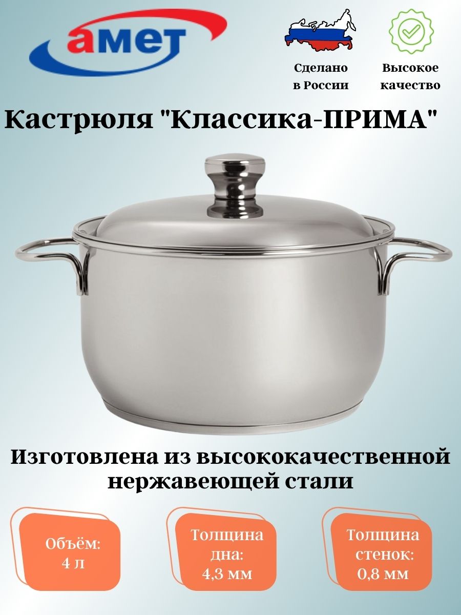 Кастрюля Амет 4 л из серии «Классика-ПРИМА» изготовлена из пищевой нержавеющей стали по требованиям ГОСТ. Выполнена в стилистике всей серии данной посуды: зеркальная поверхность, удобные прутковые ручки, металлическая крышка. За счёт лаконичного, но стильного дизайна идеально впишется в любую обстановку. Подходит для приготовления супов, фаршированных блюд, гарниров на большое число порций и т. д. Имеет теплораспределительное дно, которое обеспечивает равномерный прогрев без подгорания, долго держит температуру.