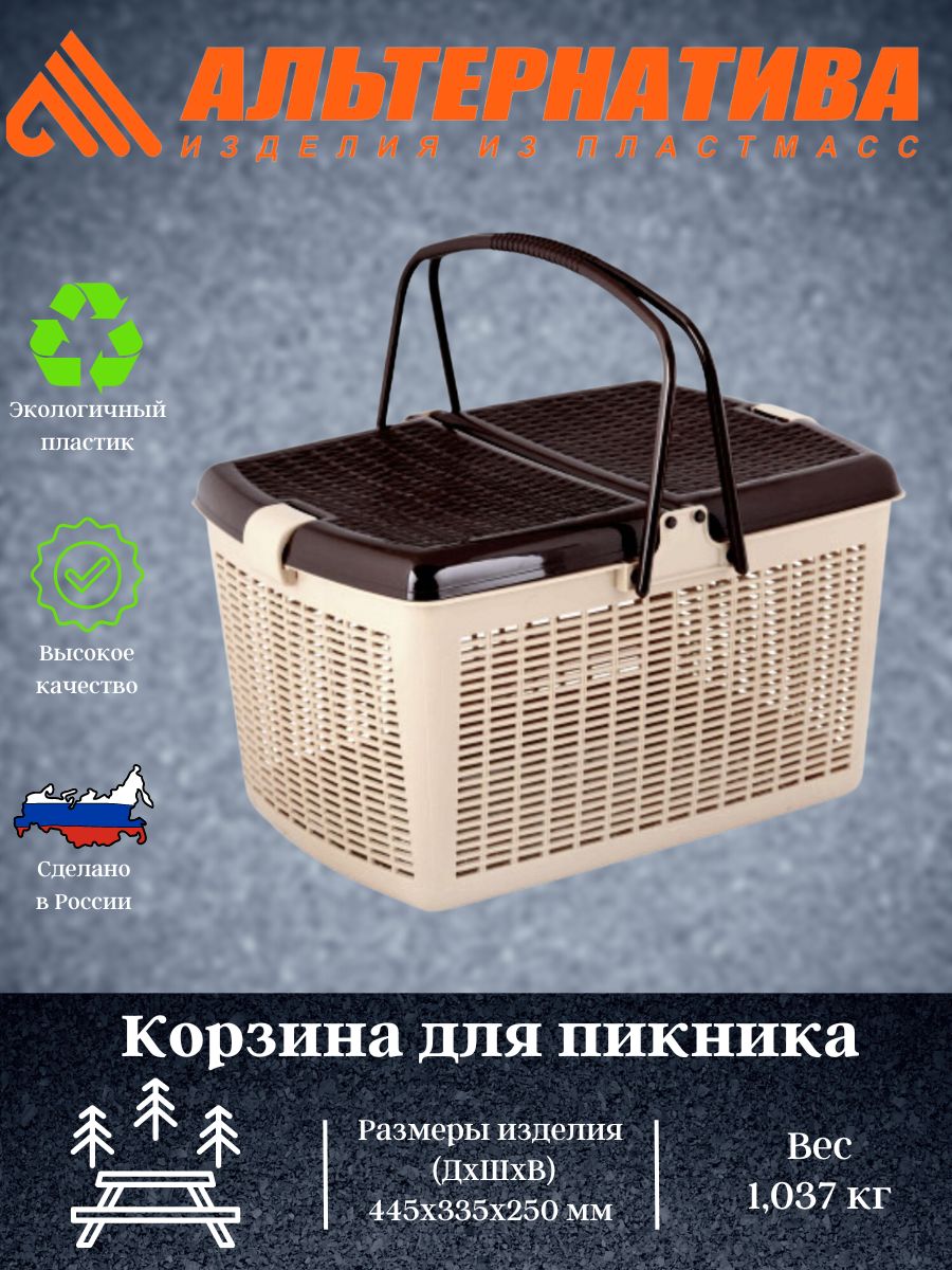 Практичная и вместительная корзина предназначена для переноски различных вещей и продуктов. Собираясь на пикник или в путешествие, Вы легко разместите все необходимое в этой корзине. Крышки на защелках защитят содержимое от высыпания, удобные ручки не выскальзывают из рук. Корзину можно также использовать для сбора и транспортировки грибов, овощей с огорода и даже продуктов из магазина.