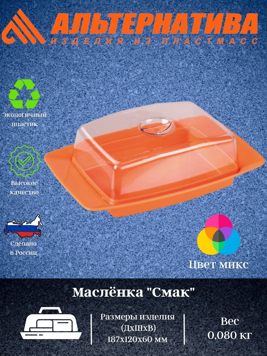 Масленка представляет собой поднос с выемками, благодаря которым крышка плотно на него устанавливается. В такой масленке масло надолго останется вкусным и свежим, а при хранении в холодильнике не впитывает посторонние запахи. Масленка «Смак» станет достойным дополнением коллекции ваших кухонных аксессуаров. Изделие рекомендуется мыть тёплой водой с применением нейтральных моющих средств.