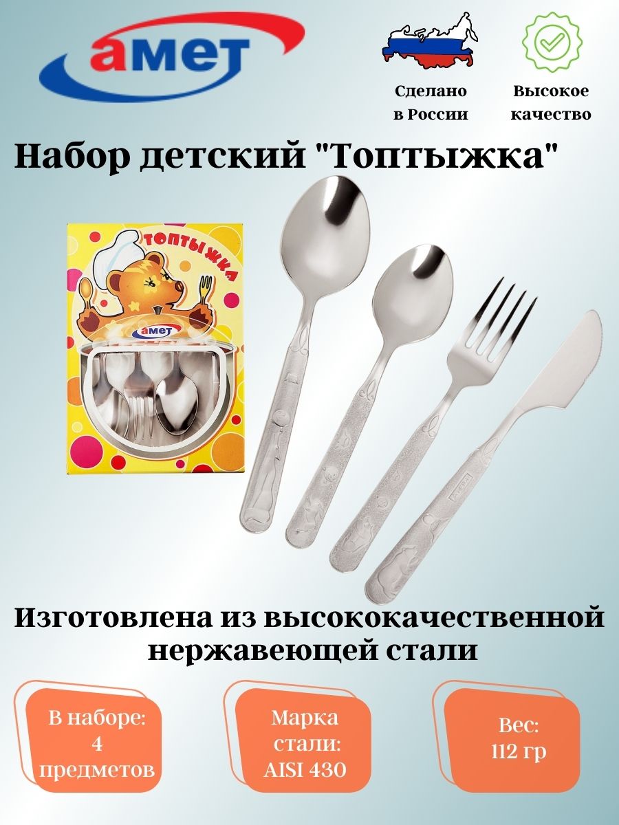 Набор 4-х предметный столовый Топтыжка Артикул 1с31. В набор входят: ложка чайная 1 шт, ложка десертная 1 шт, вилка детская 1 шт, нож детский 1 шт.