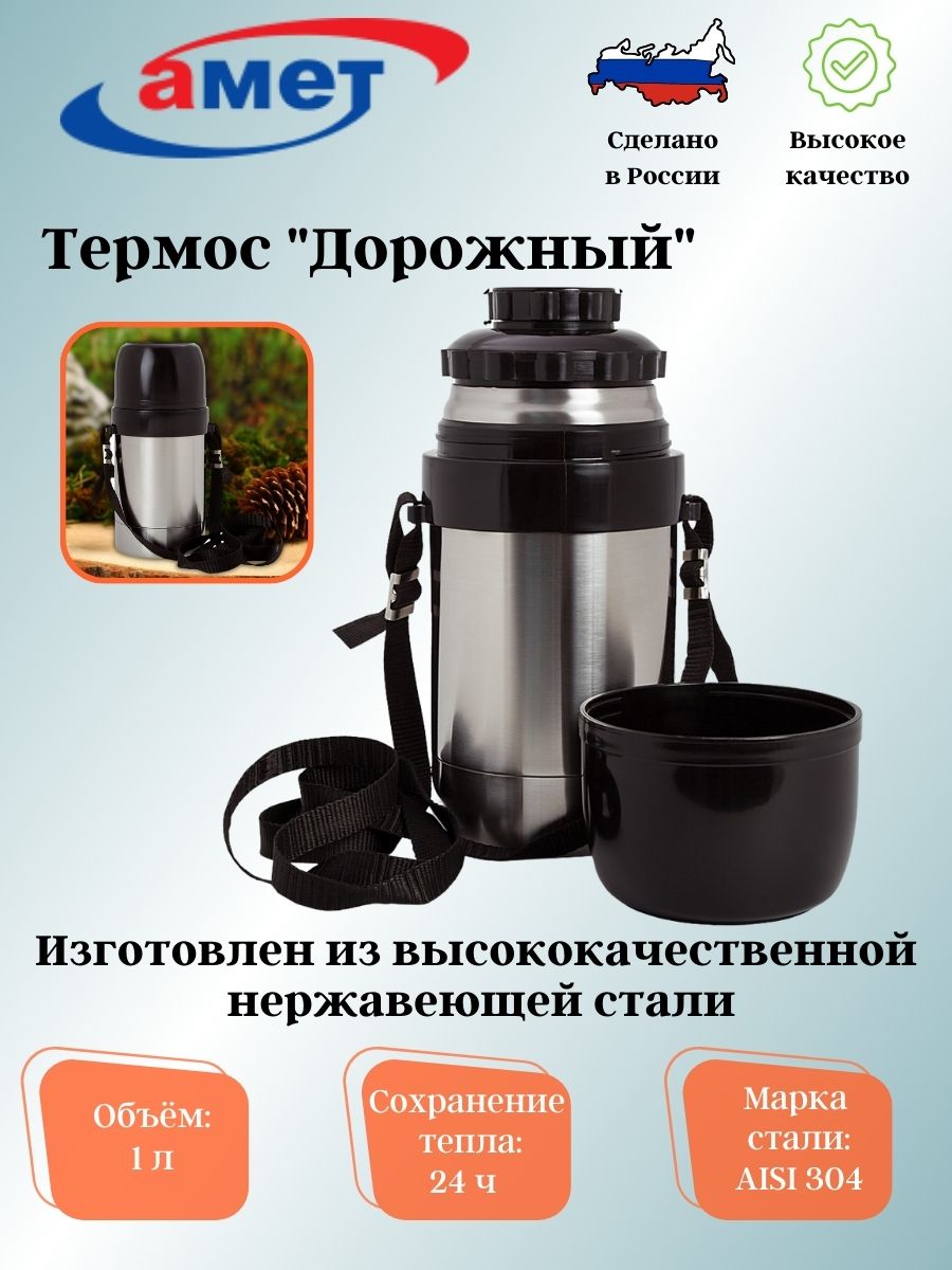 Термос «Дорожный» 1 л одинаково хорош для напитков и готовых блюд. Он имеет универсальную горловину с двойной пробкой, которая обеспечивает герметичность и удобную подачу содержимого. Крышка может использоваться как чашка. В комплект входит прочный ремень с возможностью регулировки для удобной переноски термоса.Товар производится из пищевой нержавеющей стали с использованием технологии двойной колбы с глубоким вакуумом. Она доказала свою эффективность в более длительном сохранении температуры. Металлическая колба устойчива к вибрациям и лёгким ударам, которые могут сопровождать вас в дороге.