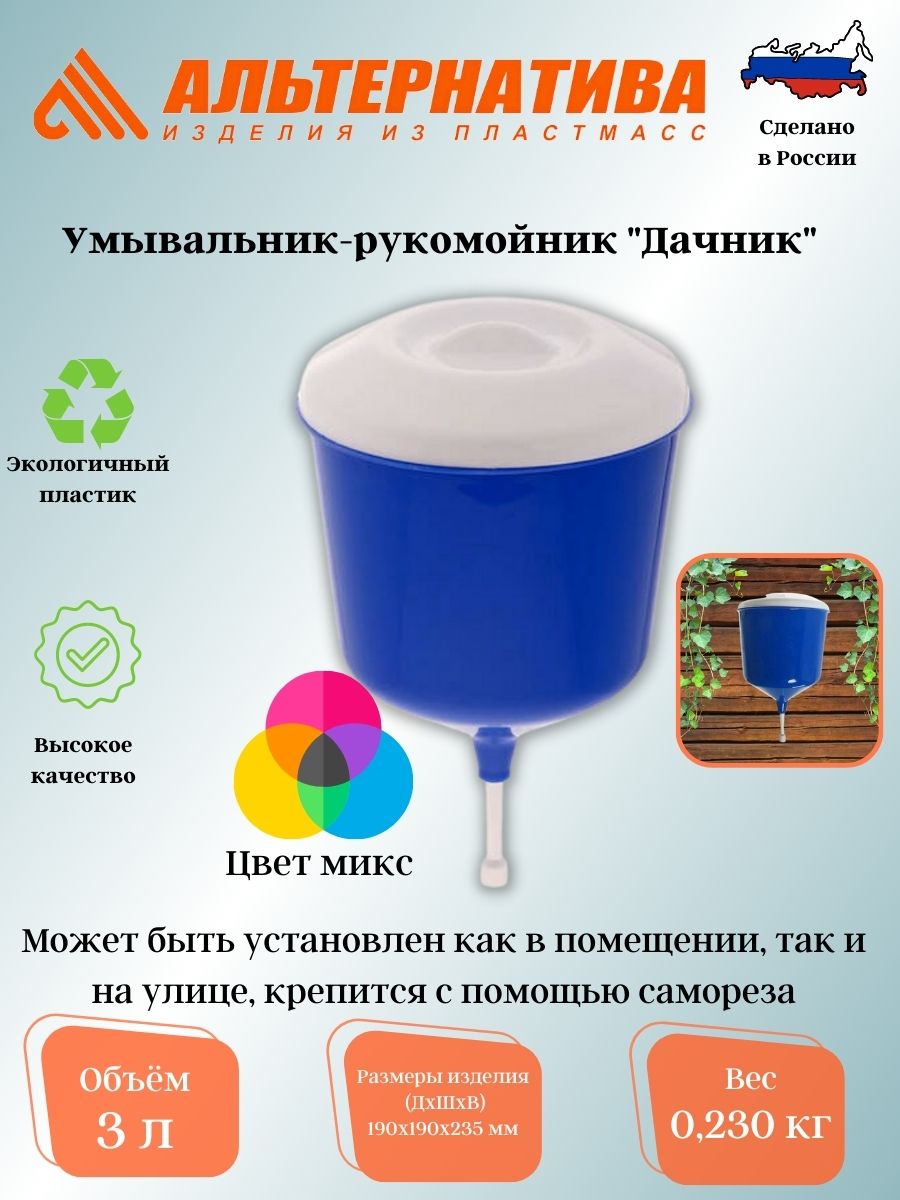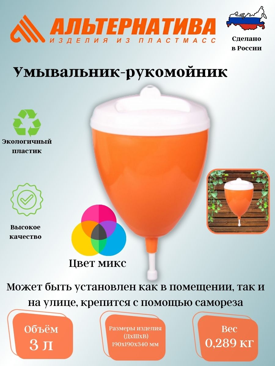Умывальник - рукомойник изготовлен из полипропилена, не имеет токсичного запаха . Может быть установлен как в помещении, так и на улице, крепится с помощью самореза. Вместительность данного рукомойника 3 литра. Изделие легко мыть и содержать в чистоте.