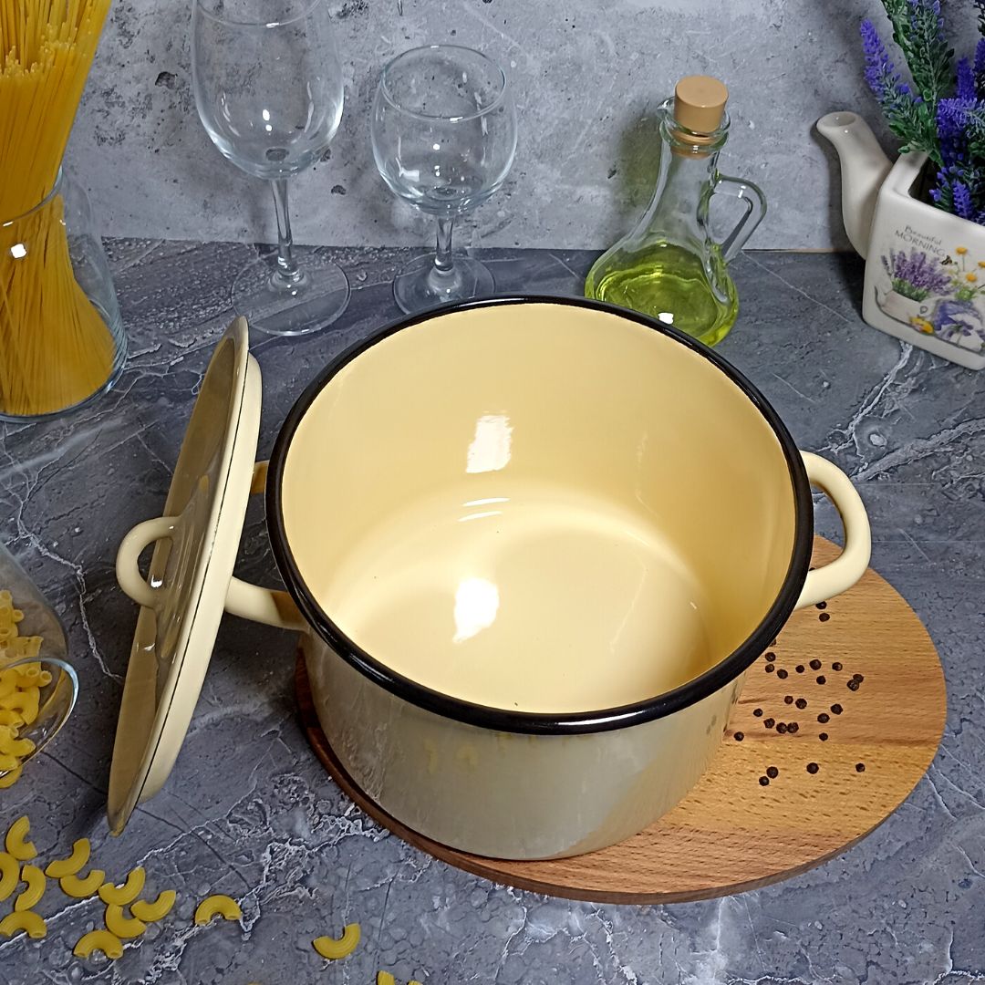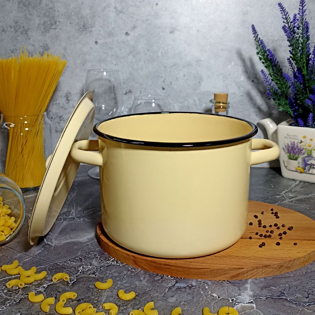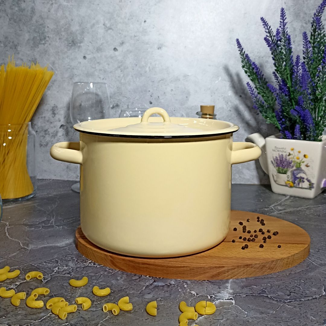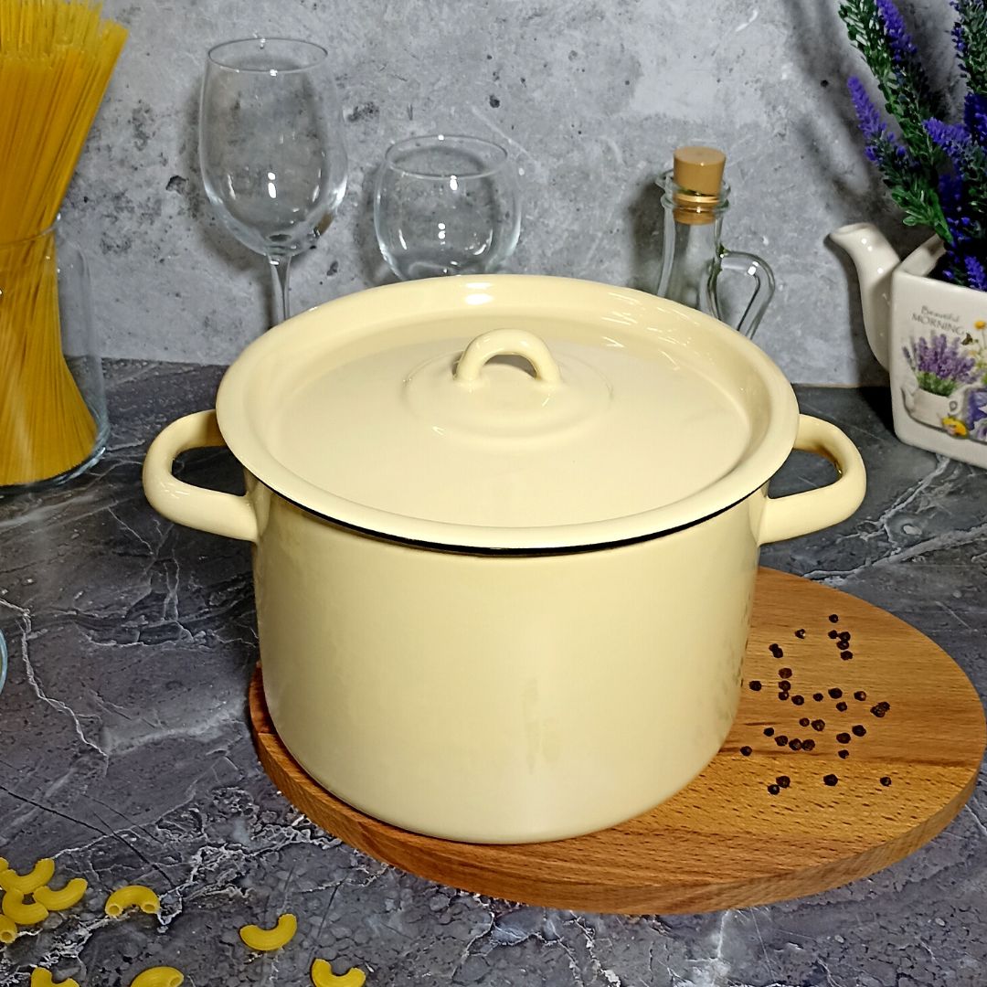 Кастрюля цилиндрическая с высоким корпусом изготовлена по ГОСТ 24788 из высококачественного стального проката, покрытого двумя слоями жаропрочной эмали. Эмалевое покрытие на основе силикатных фритт, являясь стекольной массой, не вступает во взаимодействие с продуктами, не искажает их вкусовые качества, не окисляется, при нагревании не выделяет опасные для здоровья человека соединения. Многослойное эмалевое покрытие практично, долговечно и устойчиво к появлению царапин и сколов. Прочный металлический корпус не деформируется в процессе эксплуатации и гарантирует эффективную тепловую обработку пищи.