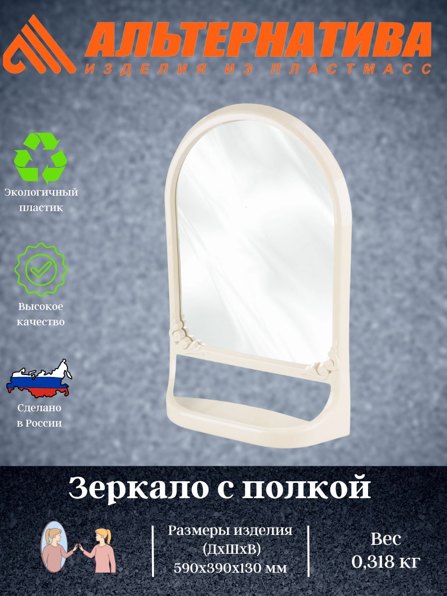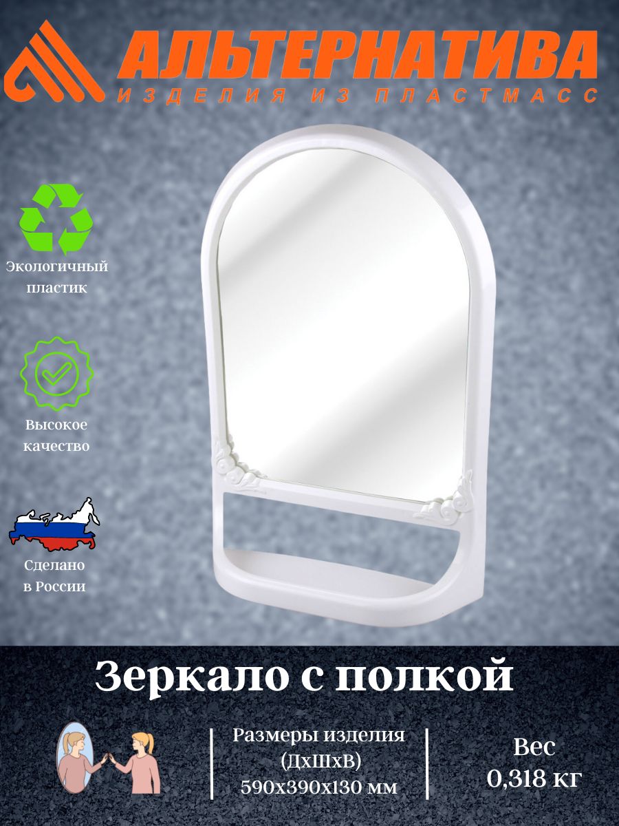 Зеркало имеет необычную форму - прямоугольную у основания и овальную в верхней части. Конструкция зеркала имеет полку, что позволяет разместить на ней ванные и другие принадлежности. Благодаря цветовым решениям, зеркало подойдет под любой интерьер, как в ванной, так и в других комнатах. В комплекте есть все необходимые крепления для установки зеркала.0.318 кг 590х390х130 мм