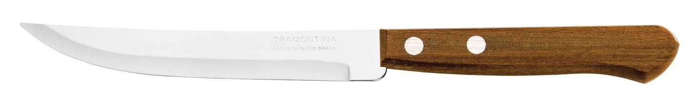 Tramontina Tradicional Нож кухонный 5" 22212/205 Материал: сталь AISI 420 Ручка: темное дерево Удобный практичный нож для повседневного использования. Такой нож не жалко взять на природу или просто иметь на кухне в запасниках. Хорошо подойдёт как столовый нож для мясных блюд. Длина лезвия 116 мм.