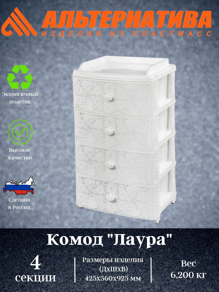 Комод произведен из высококачественного и безопасного полипропилена. При производстве используется только сертифицированное и экологически чистое, качественное сырье отечественных и зарубежных производителей. Данное изделие произведено на современном технологичном оборудовании, а потому отличается прочностью и устойчивостью разнообразным механическим воздействиям. Также особую прочность изделию придает цельная конструкция перегородок. Оригинальный внешний вид задает кружевная конструкция поверхности лицевой части ящика. Комод имеет четыре широких выдвижных ящика большой вместимости, в которых будет очень удобно хранить личные вещи и другие принадлежности.