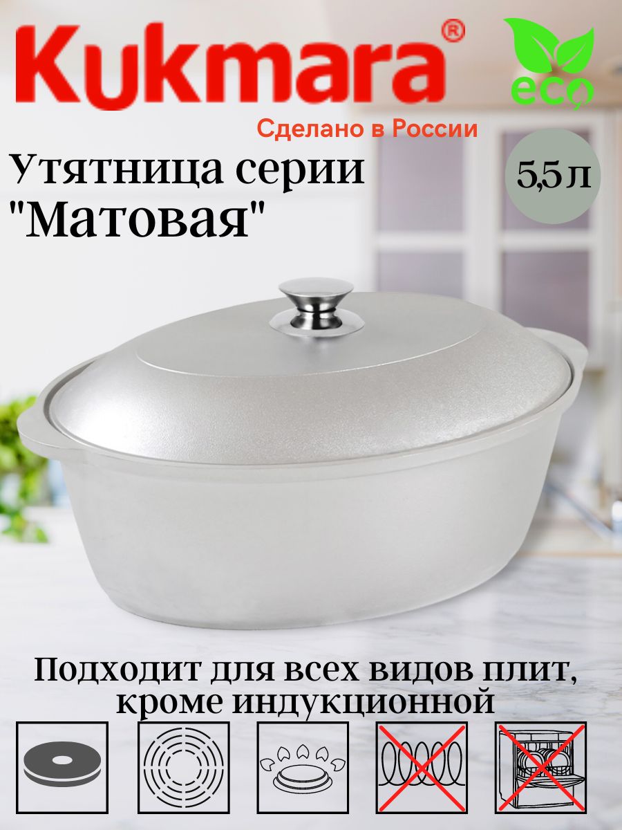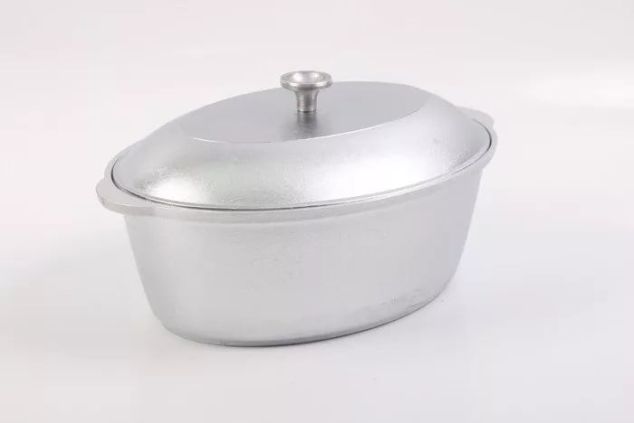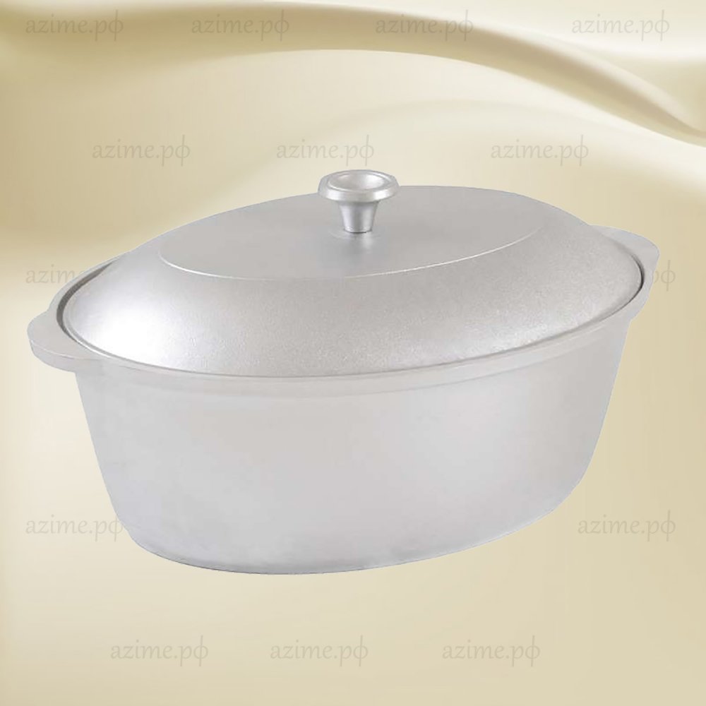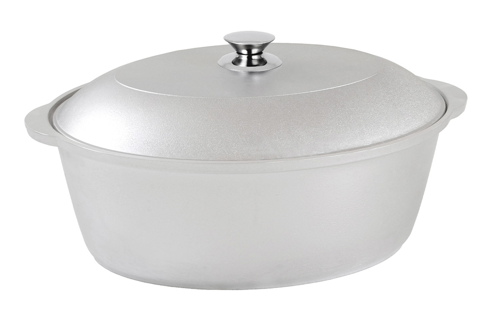 Утятница – это универсальная кастрюля овальной формы с металлической крышкой и ручкой из нержавеющей стали. В такой посуде особенно удобно готовить крупные куски мяса или птицу целиком. Благодаря возможности использования посуды в духовом шкафу, можно тушить блюда с сохранением влаги под закрытой крышкой. Утятницу также можно использовать на плите как обычную кастрюлю для варки и тушения на небольшом и среднем огне – благодаря прекрасным теплораспределительным свойствам алюминия она равномерно прогреваются по всему корпусу. Литая алюминиевая посуда - идеальное соотношение демократичной цены, традиционного дизайна и проверенного покупателями качества. Эта посуда подходит для готовки в любых условиях, в том числе и на открытом огне. Посуду из литого алюминия без покрытия нельзя мыть в посудомоечной машине.