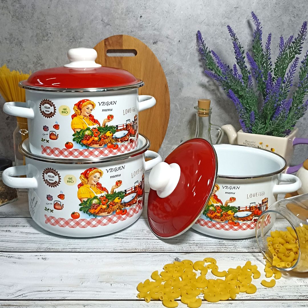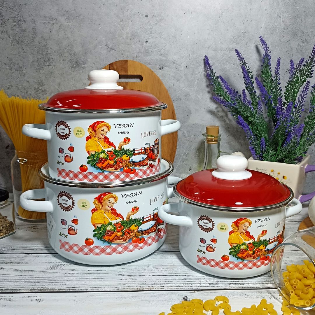 Набор из трех цилиндрических кастрюль. Посуда изготовлена по ГОСТ 24788 из высококачественного стального проката, покрытого двумя слоями жаропрочной эмали. Борта корпусов и крышек кастрюль защищены нержавеющим ободком.Подходит для всех видов плит, в том числе индукционных.Можно мыть в посудомоечной машине.Может использоваться для длительного хранения пищевых продуктов.