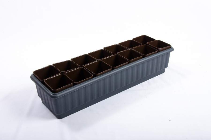 Ящик для выращивания цветов и рассады домашних условиях 600*180*130. В набор входят^ поддон с дренажной решеткой и 14 стаканчиков с выдвижным дном (объем стакана 460 мл). Стаканчики со съемным донышком позволяют бережно пересаживать рассаду в открытый грунт, сохраняя хрупкую корневую систему молодых растений. Дренажная решетка в поддоне отводит лишнюю влагу и препятствует загниванию корней. Рассадник предназначен для многоразового использования, легко моется и компактно хранится между сезонами.