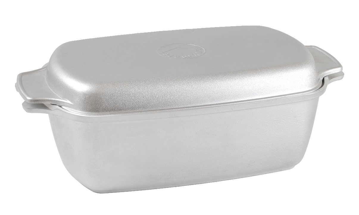 Посуда из литого алюминия может прослужить долгие годы, сохраняя свои теплораспределительные и теплоаккумулирующие свойства. Блюда в такой посуде получаются сочными и ароматными. Гусятница – это универсальная кастрюля прямоугольной формы с плоской крышкой-сковородой. В такой посуде особенно удобно готовить крупные куски мяса или птицу целиком. Благодаря возможности использования посуды в духовом шкафу, можно тушить блюда с сохранением влаги под закрытой крышкой, либо запекать их, добиваясь хрустящей корочки. Гусятницу также можно использовать на плите как обычную кастрюлю для варки и тушения на небольшом и среднем огне – благодаря прекрасным теплораспределительным свойствам алюминия она равномерно прогреваются по всему корпусу.
