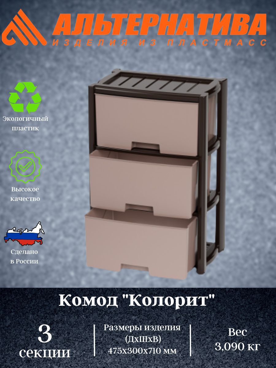 Комод произведен из высококачественного и безопасного полипропилена. Особую прочность комоду придает его цельная конструкция перегородок. Комод имеет выдвижные и достаточно вместимые ящики. На крышке и перегородках предусмотрены ограничители, благодаря которым ящик не будет вылетать при открывании. Такой комод станет отличным решением для организации хранения практически в любой комнате вашей квартиры или дома. Благодаря цветовому решению и современному дизайну, комод гармонично впишется в интерьер любой комнаты. Благодаря небольшому весу и компактному размеру, комод легко устанавливается и передвигается.
