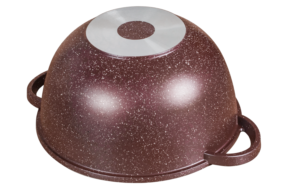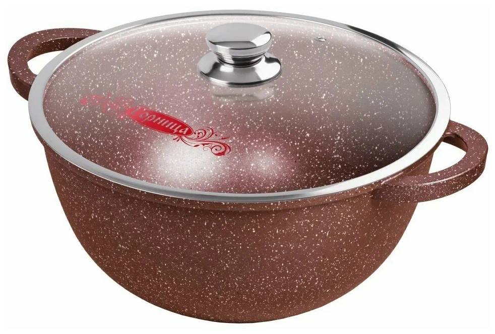 Казаны с цельнолитыми ручками можно использовать в духовом шкафу. «Шоколад». Коллекция посуды с улучшенным четырёхслойным антипригарным покрытием. Дополнительный слой с мраморным эффектом увеличивает износостойкость и создаёт оригинальный цветовой эффект мрамора шоколадного оттенка. Литой пищевой алюминий не имеет канцерогенных веществ и посторонних запахов. Толстые стенки и дно обеспечивают равномерное приготовление блюда.