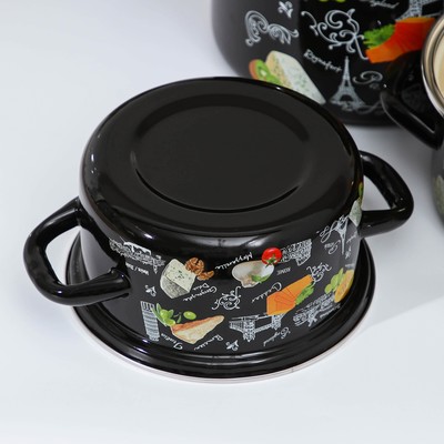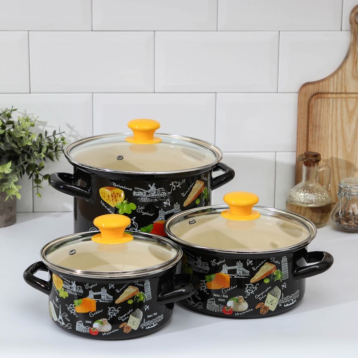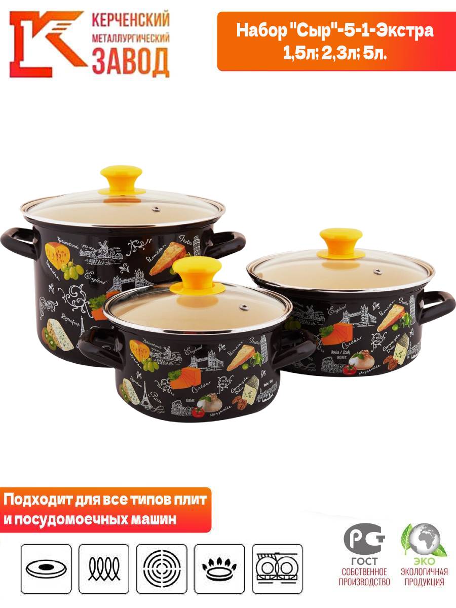 Состав набора: кастрюля 1,5 л, кастрюля 2,3 л, кастрюля 5 л.