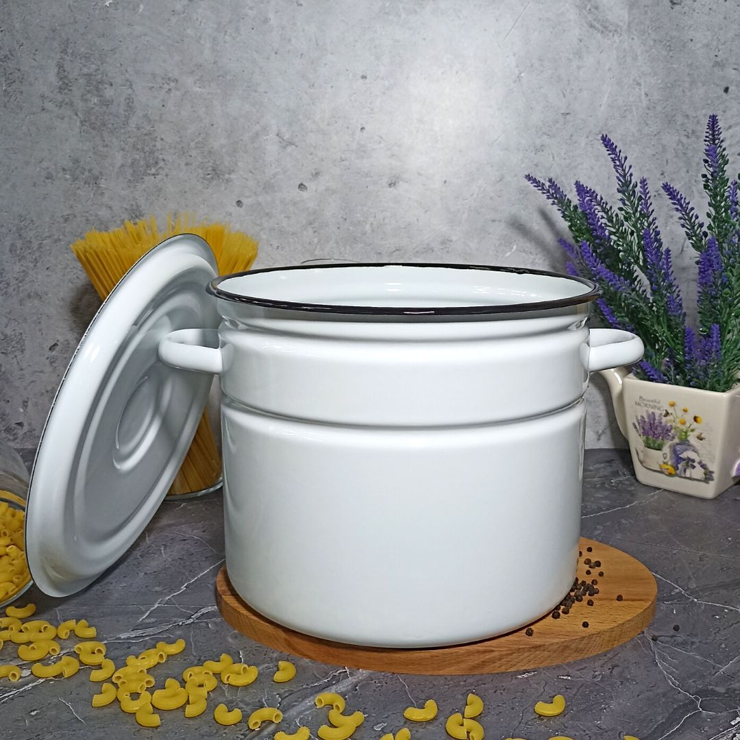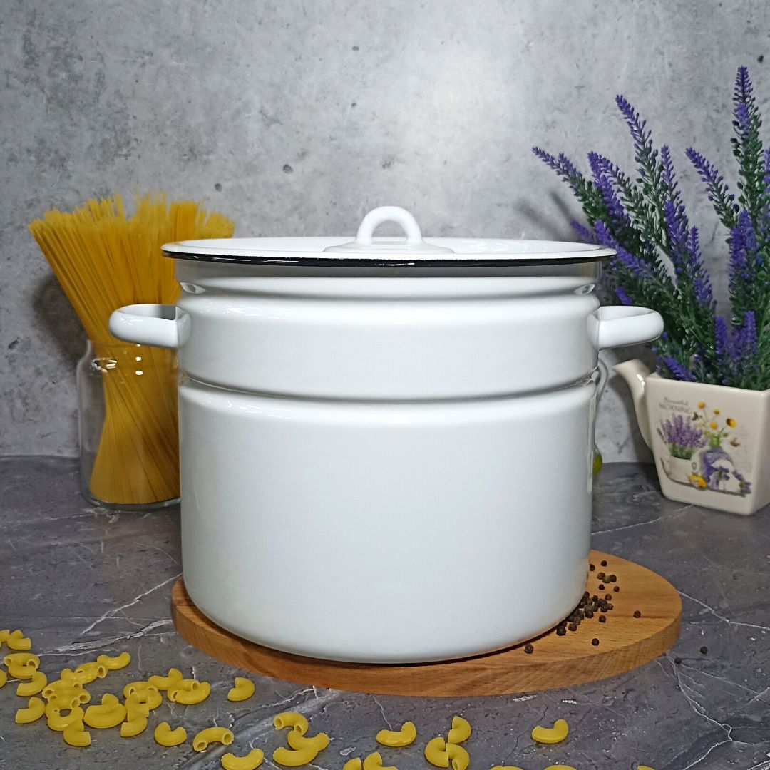 Кастрюля цилиндрическая с высоким корпусом изготовлена по ГОСТ 24788 из высококачественного стального проката, покрытого двумя слоями жаропрочной эмали. Эмалевое покрытие на основе силикатных фритт, являясь стекольной массой, не вступает во взаимодействие с продуктами, не искажает их вкусовые качества, не окисляется, при нагревании не выделяет опасные для здоровья человека соединения. Многослойное эмалевое покрытие практично, долговечно и устойчиво к появлению царапин и сколов. Прочный металлический корпус не деформируется в процессе эксплуатации и гарантирует эффективную тепловую обработку пищи.