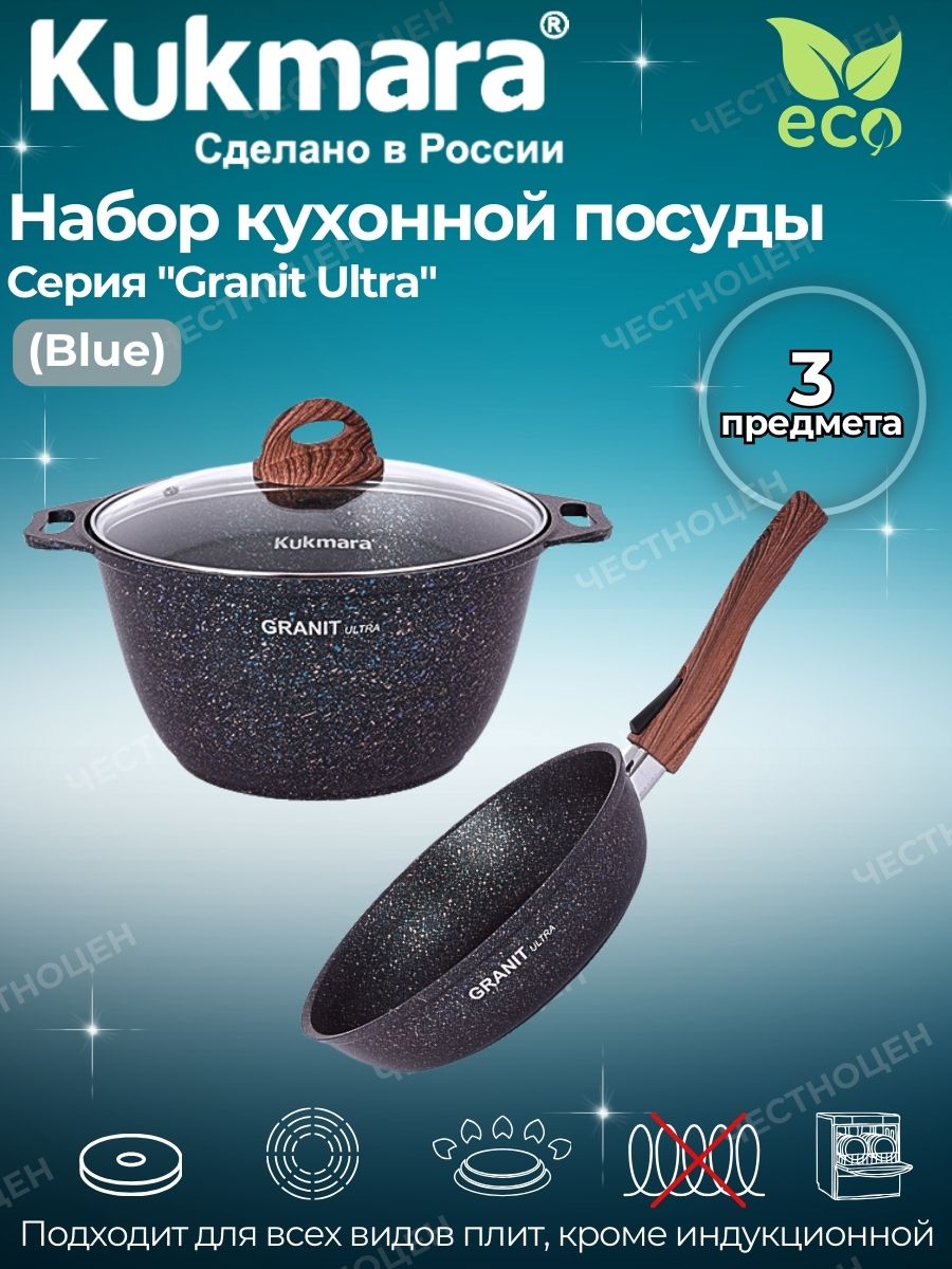 Набор посуды Kukmara станет прекрасным подарком на любое торжество и оставит приятные воспоминания на долгие годы. В состав набора посуды линии Granit ultra входят кастрюля 4 л со стеклянной крышкой и сковорода 24 см со съемной ручкой - идеальный тандем для успеха на кулинарном поприще! Стеклянная крышка подходит и для кастрюли, и для сковороды. Посуда имеет отличные теплораспределительные и теплоаккумулирующие свойства, и блюда в ней получаются сочными и ароматными.Ультрапрочное многослойное антипригарное покрытие ultra granit позволяет использовать даже неострые металлические предметы. Такое покрытие, усиленное сверхтвердыми минералами близкими по твердости к алмазу, гарантирует долгий срок службы даже при ежедневном использовании, при этом абсолютно безопасно для здоровья, без PFOA.