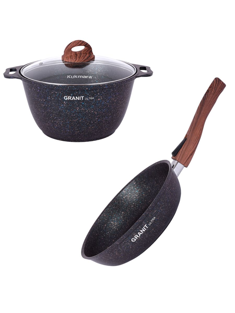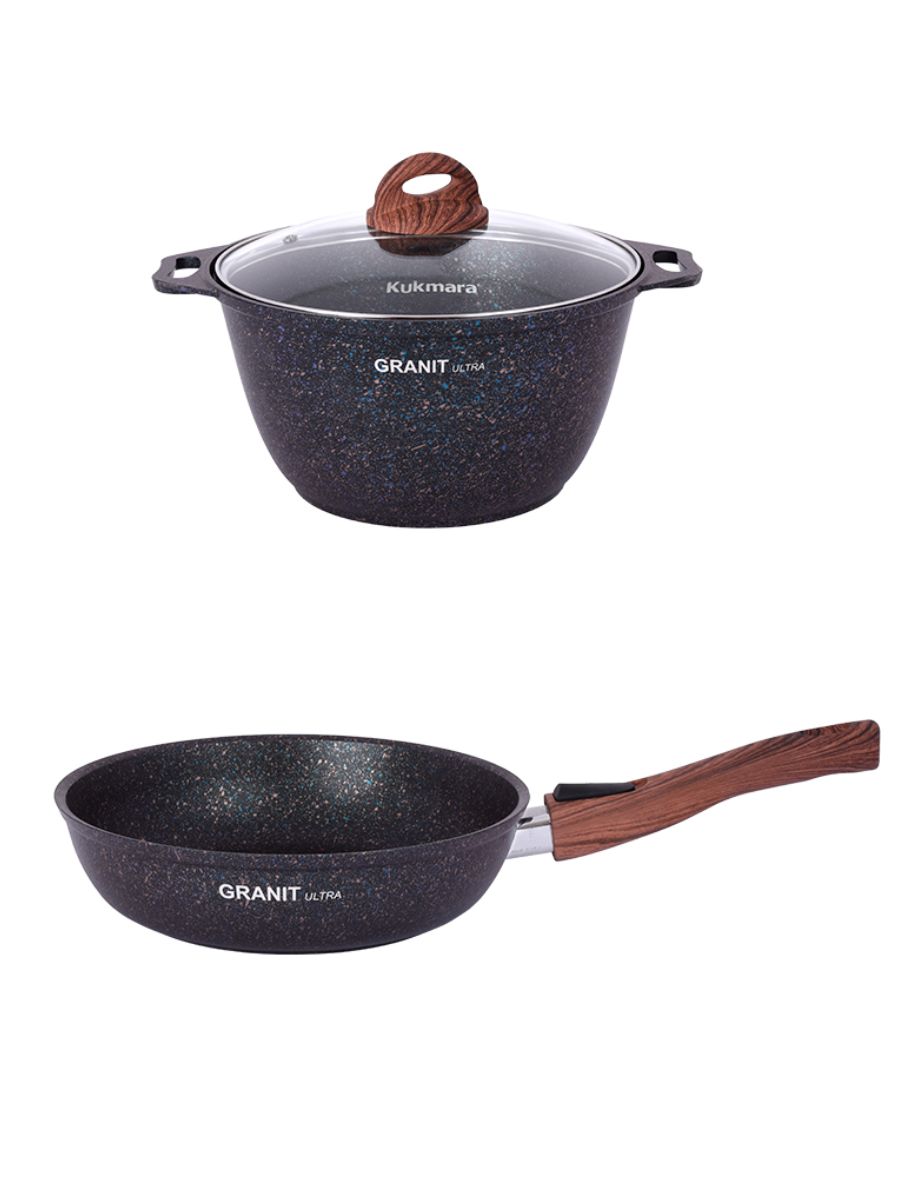 Набор посуды Kukmara станет прекрасным подарком на любое торжество и оставит приятные воспоминания на долгие годы. В состав набора посуды линии Granit ultra входят кастрюля 4 л со стеклянной крышкой и сковорода 24 см со съемной ручкой - идеальный тандем для успеха на кулинарном поприще! Стеклянная крышка подходит и для кастрюли, и для сковороды. Посуда имеет отличные теплораспределительные и теплоаккумулирующие свойства, и блюда в ней получаются сочными и ароматными.Ультрапрочное многослойное антипригарное покрытие ultra granit позволяет использовать даже неострые металлические предметы. Такое покрытие, усиленное сверхтвердыми минералами близкими по твердости к алмазу, гарантирует долгий срок службы даже при ежедневном использовании, при этом абсолютно безопасно для здоровья, без PFOA.