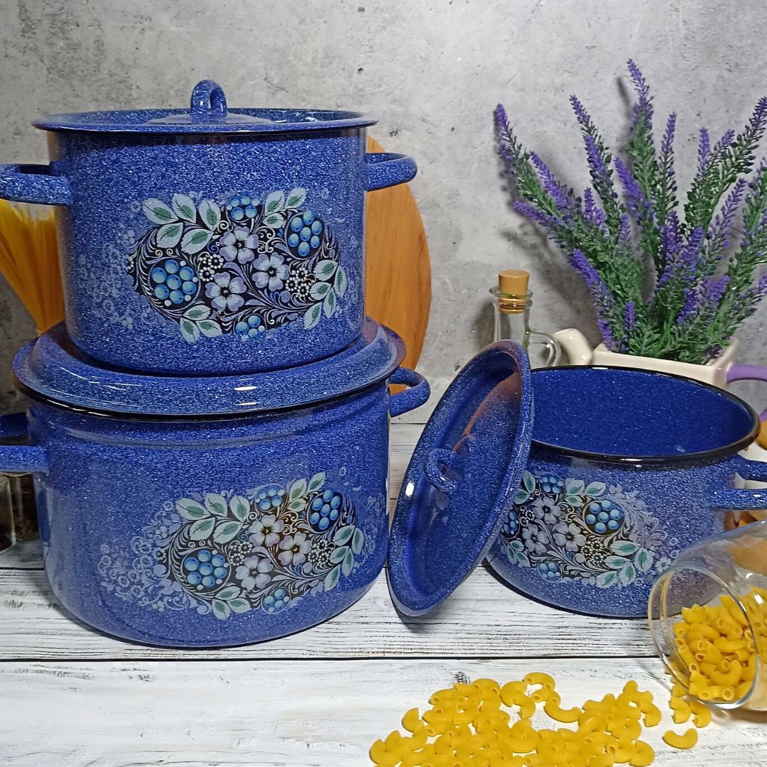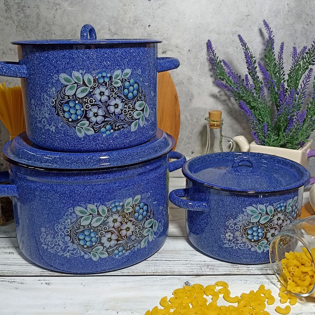 Набор их трёх цилиндрических кастрюль с высоким корпусом изготовлен по ГОСТ 24788 из высококачественного стального проката, покрытого двумя слоями жаропрочной эмали. Эмалированная посуда подходит для кухонных плит любого типа, в том числе индукционных, а так же для использования в посудомоечной машине. Эмалевое покрытие наружной поверхности посуды является стойким к прямому контакту с пламенем газовой горелки бытовых газовых плит.На дне и под бортом изделий могут присутствовать следы от обжигового инструмента, которые не относятся к браковочным признакам и не влияют на эксплуатационные свойства и безопасность посуды.