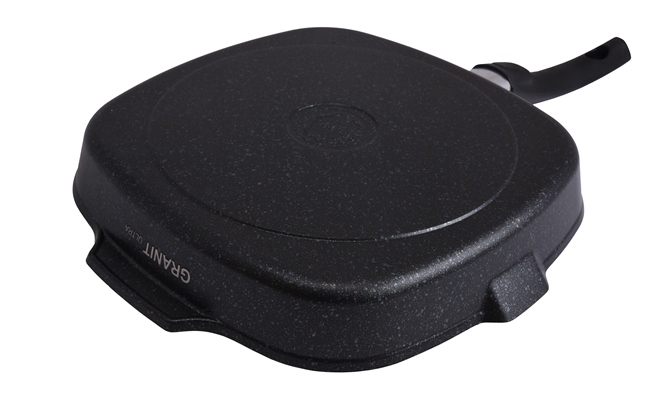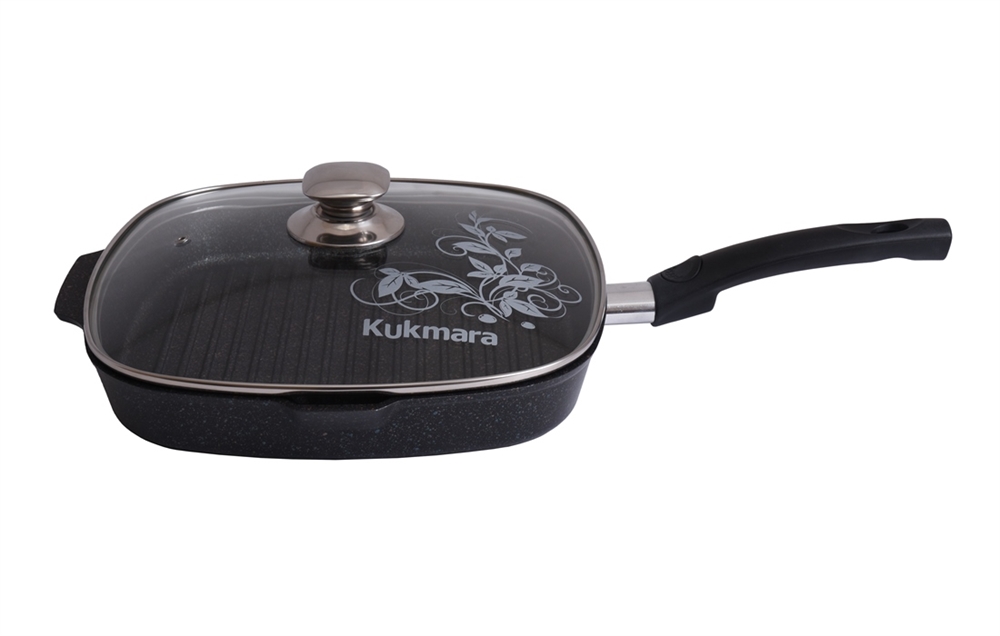 Восторг на кухне вызовет популярная сковорода-гриль, идеально подходящая для жарки мяса и овощей. Ее изюминка – это особое ребристое дно, благодаря которому блюда не только выглядят аппетитнее, но и получаются сочными и ароматными. Сковорода-гриль Kukmara из литого алюминия имеет отличные теплораспределительные и теплоаккумулирующие свойства. Сковороду со снятой ручкой, с крышкой, можно использовать в духовом шкафу. Благодаря съемной бакелитовой ручке, обеспечивается удобное хранение.Ультрапрочное многослойное антипригарное покрытие ultra granit позволяет использовать даже неострые металлические предметы.