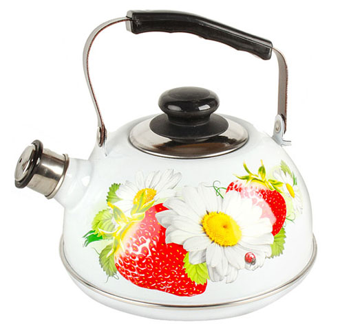 Чайник эмалированный со свистком. Внешнее трехслойное эмалевое покрытие не вступает во взаимодействие с пищевыми продуктами, защищает сталь от коррозии, придает посуде гладкую стекловидную поверхность и надежно защищает от кислот и щелочей. Подвижная ручка. Свисток съемный из нержавеющей стали. Крышка плотно прилегает к краю. Может быть использован на всех типах кухонных плит: электрических, газовых, керамических, индукционных. Подходит для мытья в посудомоечной машине.
