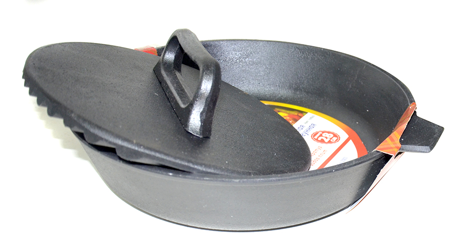Сковорода гриль литая чугунная 280*60 с двумя ушками с чугунной крышкой гу8063