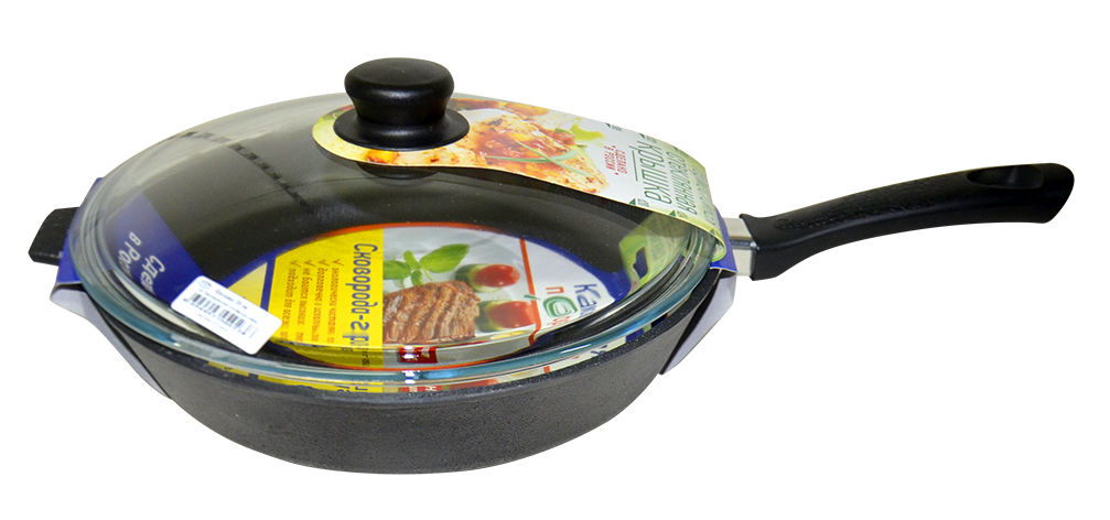 Сковорода гриль литая чугунная 280*60 с бакелитовой ручкой со стеклянной крышкой г8062