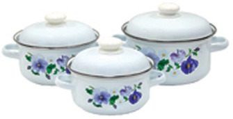 Набор эмалированных кастрюль "Сочная клубника" состоит из 3 кастрюль разного объема.