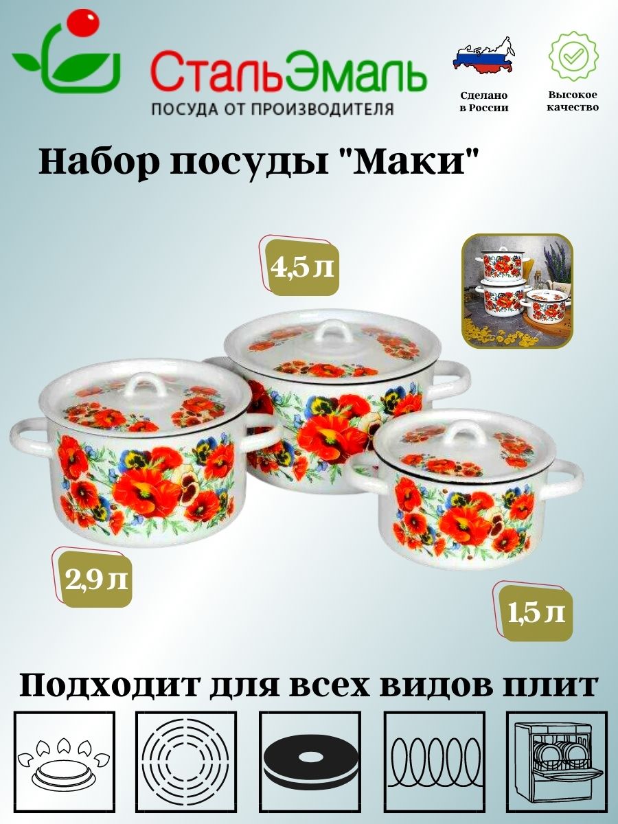 Набор кастрюль «Маки. Мечта», 3 предмета: 1,5 л, 2,9 л, 4,5 л, цвет белый