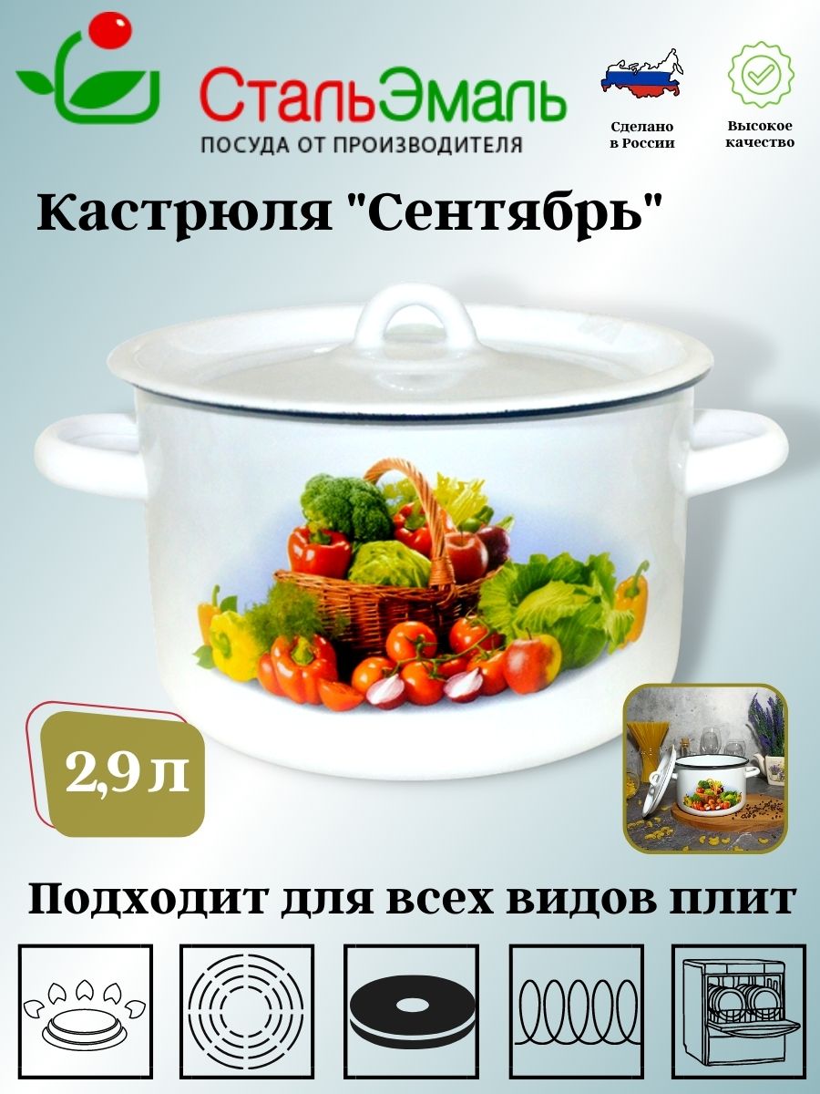 Кастрюля "Сентябрь" объемом 2,9 литра станет незаменимым помощником на вашей кухне. Изготовлена из качественной эмалированной стали, что обеспечивает долговечность и надежность изделия.
