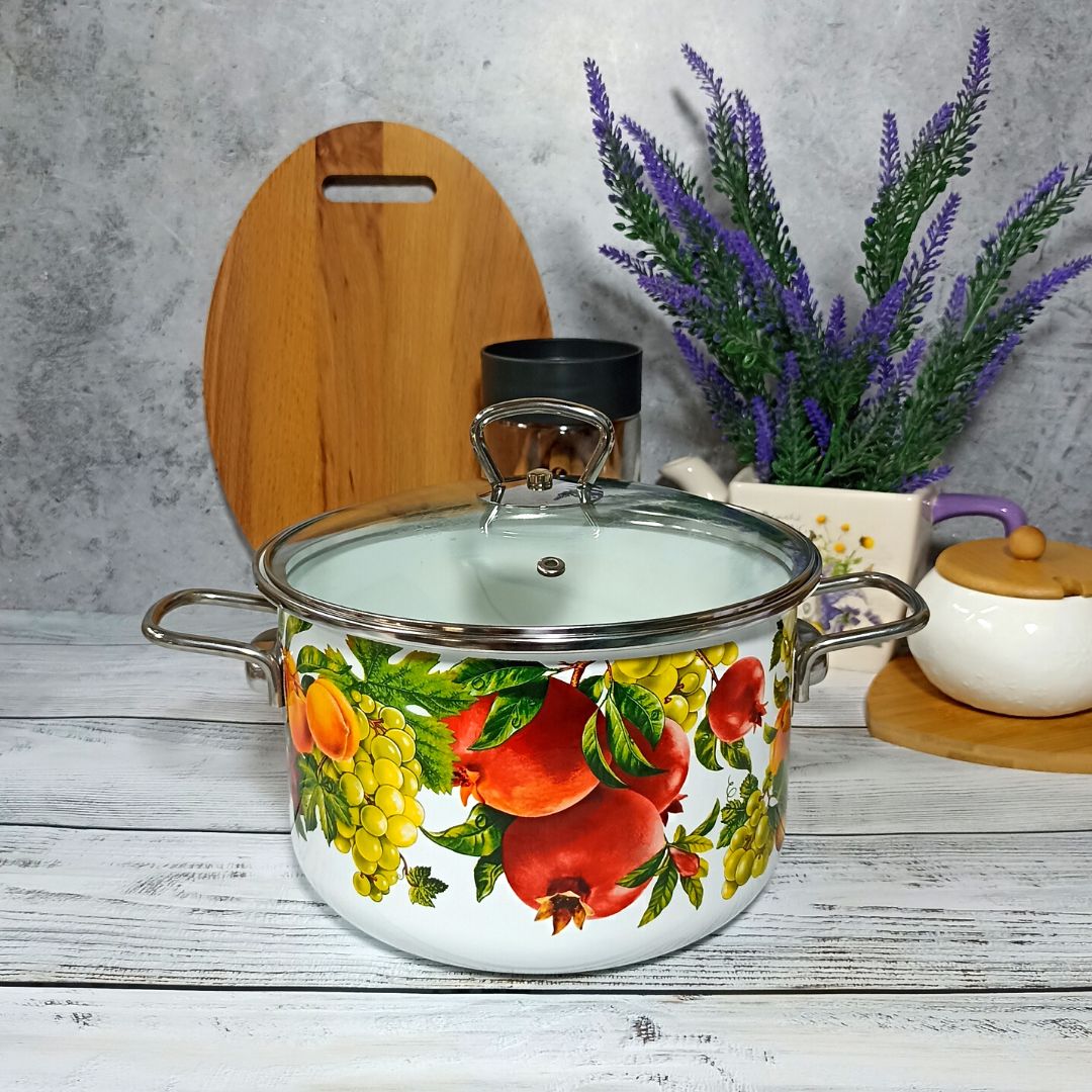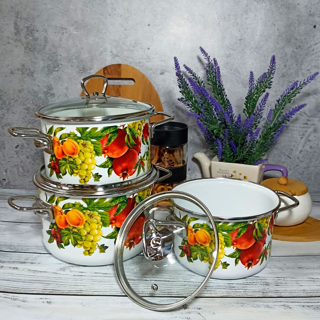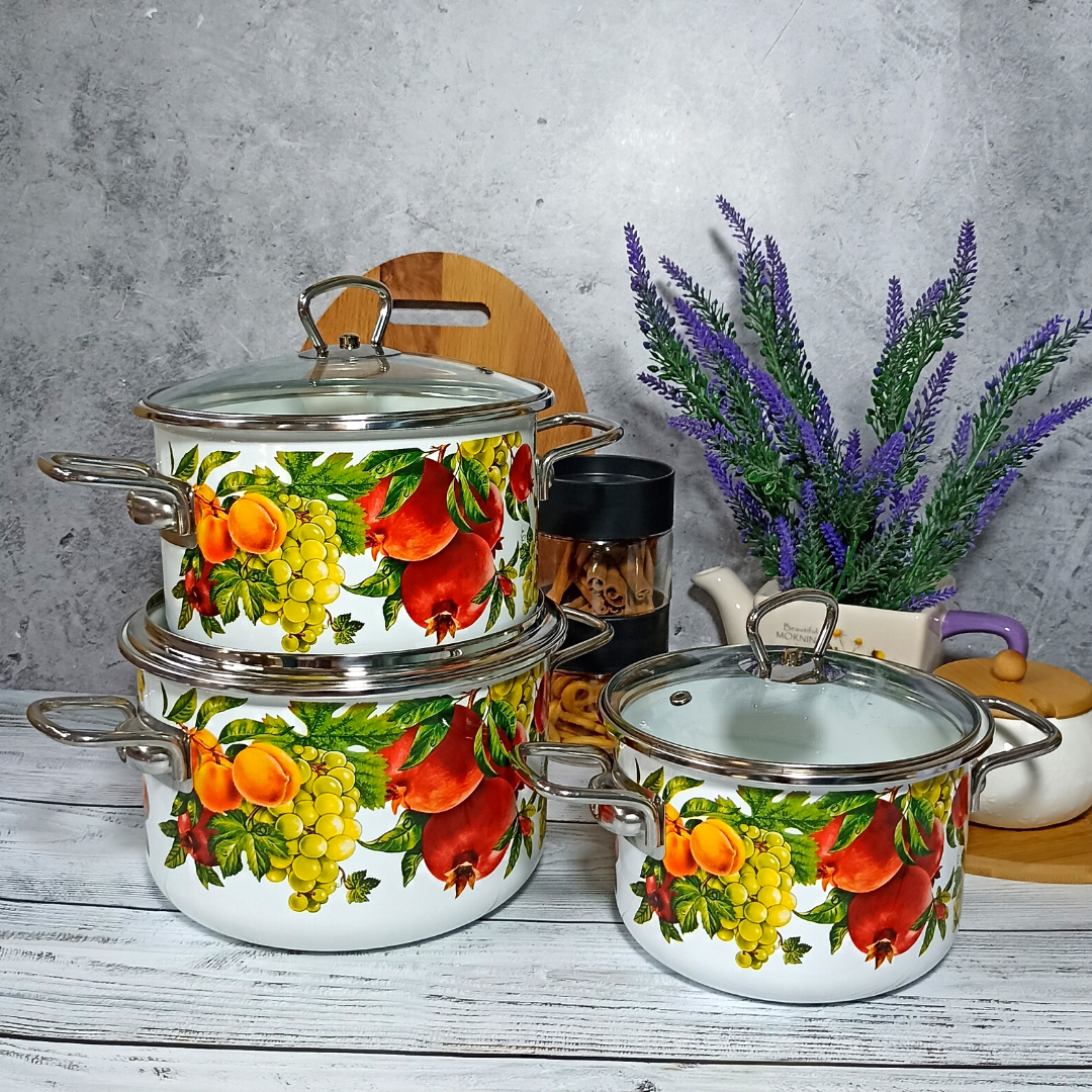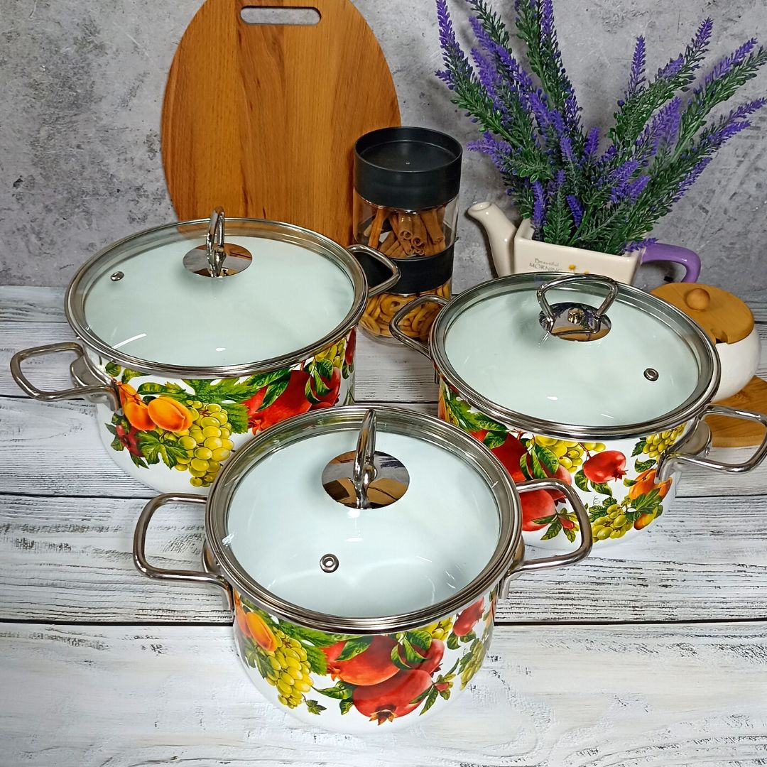 Набор стальных эмалированных кастрюль цилиндрической формы для тепловой обработки пищевых продуктов. Кастрюли комплектуются крышками из жаропрочного стекла с пароотводом, эргономичными ручками из коррозионно-стойкой стали, борта защищены нержавеющим ободком. Посуда изготовлена по ГОСТ 24788 из высококачественного стального проката, покрытого двумя слоями жаропрочной эмали. Увеличенная толщина металлического корпуса изделий (1 мм) обеспечивает более равномерное распределение и сохранение тепла при приготовлении пищи на любых видах плит, в т.ч. индукционных.Посуда может быть использована для тепловой обработки пищевых продуктов, для приготовления холодных блюд и сервировки стола, для хранения и переноски пищевых продуктов, для вспомогательных целей.
